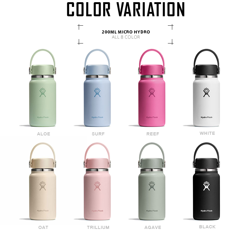 HydroFlaskは温度を最大限保つために二重壁真空断熱技術(TempShield)をすべてのボトル製品に採用しています。さらに底部には、特許取得の独自技術により確実な真空を生み出すことによって、従来の重厚な蓋が不必要となり軽量化に成功しました。またテイパード構造、トップは軽量化のために極薄になったのでこれまでの同サイズのボトルと比べ、約25%の軽量化に成功しました。 温かさも冷たさも、ちょうどいい量で。 200mlのミニマルなマイクロサイズボトルは、腰やバッグに気軽に装着でき、アクセサリー感覚で持ち歩けます。小さくても使い道は自在。日常にフィットする新しいサイズ感です。