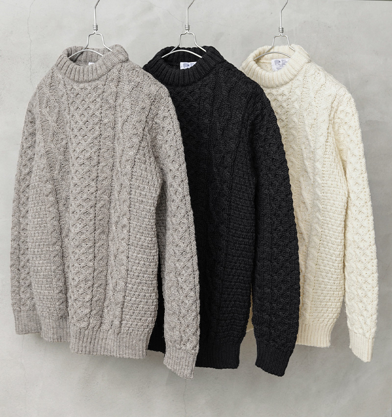 300年以上の歴史を持つ工場で作られたニットブランドのKERRY WOOLLEN MILLS ケリーウーレンミルズより本格的なアラン編みニットを使用したクルーネックセーターが入荷しました。別名「フィッシャーマンズセーター」ともいい、縄上に編まれた模様のケーブルニットのことで、アイルランドのアラン諸島で漁師用のニットとして漁に使うロープや命綱をイメージした模様を編み込んだものをアラン編みと呼びます。ケーブルニットにすることでより分厚く、首元もきっちりと編み込まれていますので、風を通さず熱を逃がさない暖かく丈夫なニットへと仕上がっています。