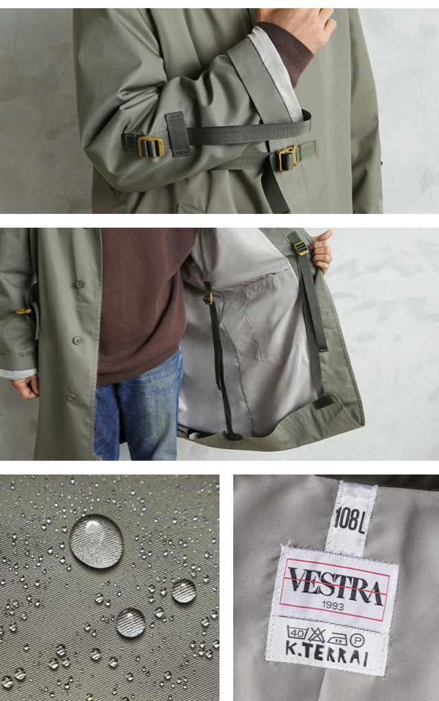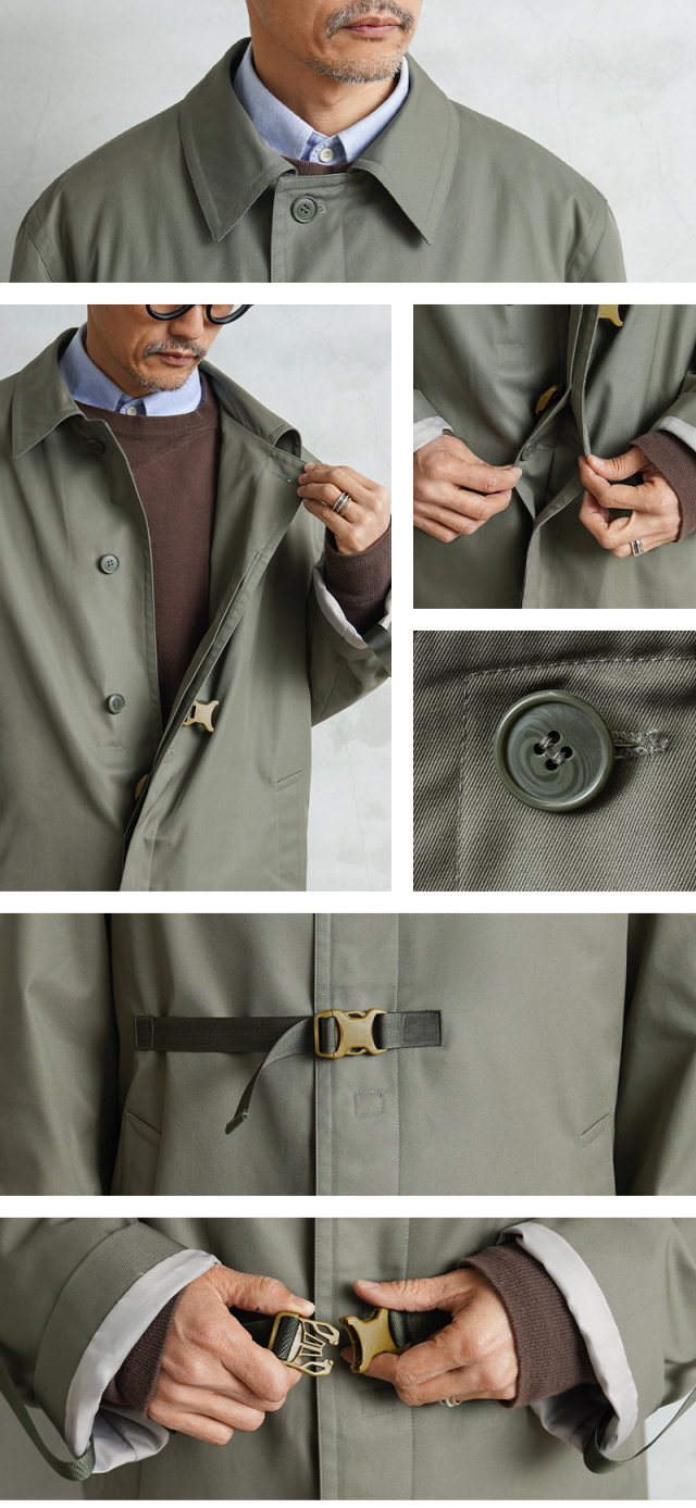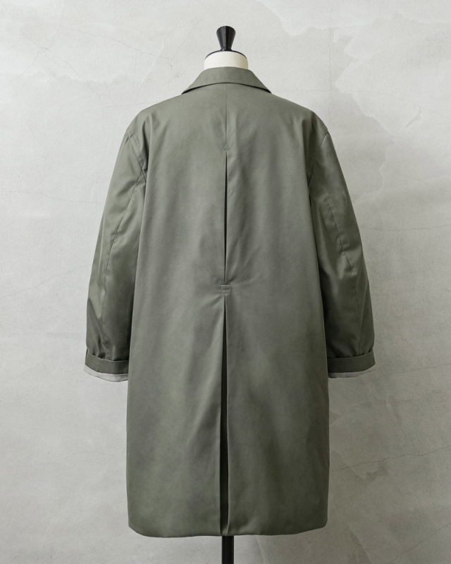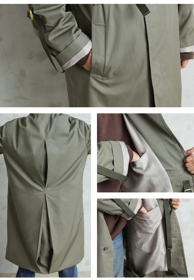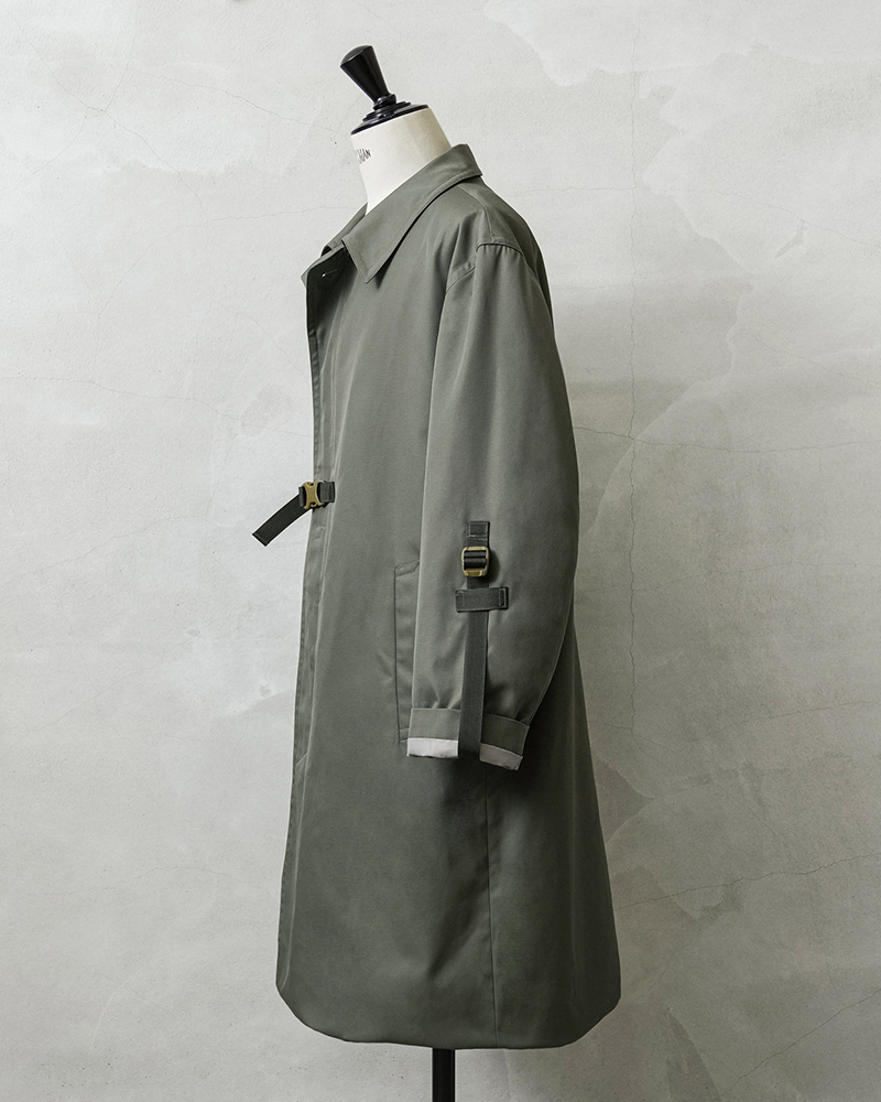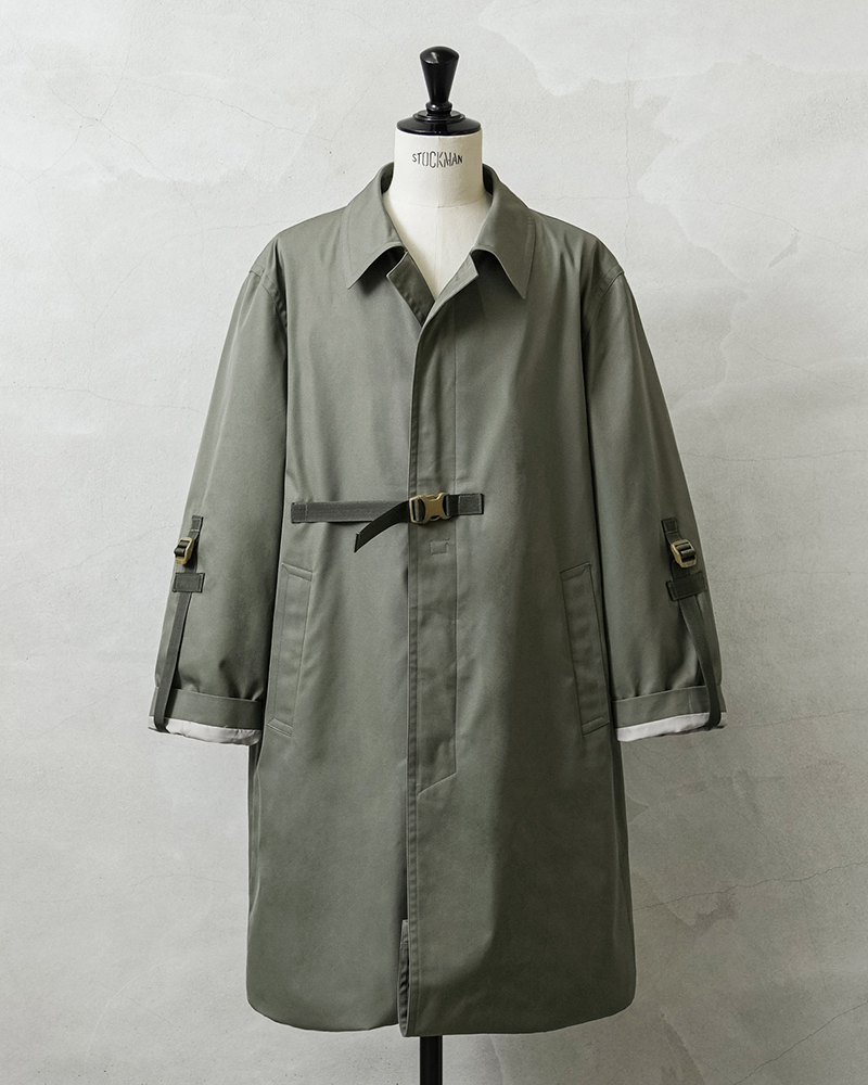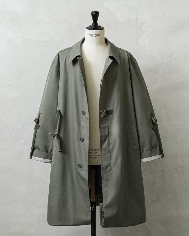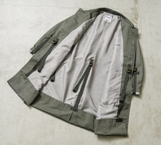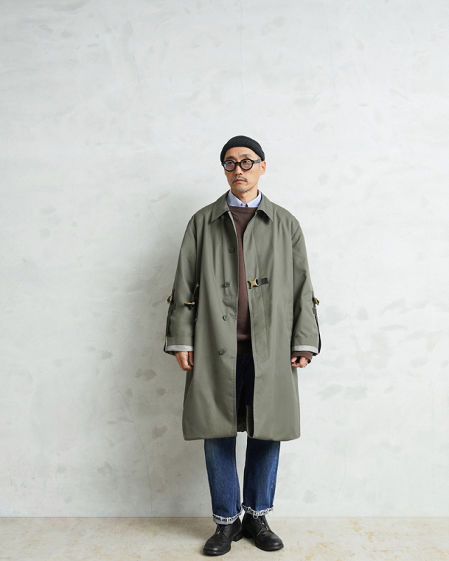 90年代から2000年代にフランス軍で使用されていたステンカラーコートを、KOUHEI TERRAIがより使いやすくリメイクを施しました。 デザインはシンプルで、フロントは比翼仕様、両サイドにポケット、そしてバックは大きくアクションプリーツをとったデザインです。 肩に配置されていたエポレットを、元からなかったかのように丁寧に取り外しています。 本来は着丈や袖丈が長く日本人がそのまま着用するには難しいサイズ感ですが、袖口や裾口にデザインのアクセントにもなっている調整コードを配置することで、着丈や袖丈の調整が可能になりました。長短でシルエット変更が出来る稀有なデザインが特徴です。