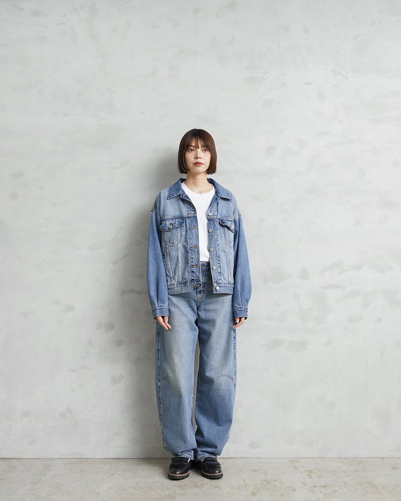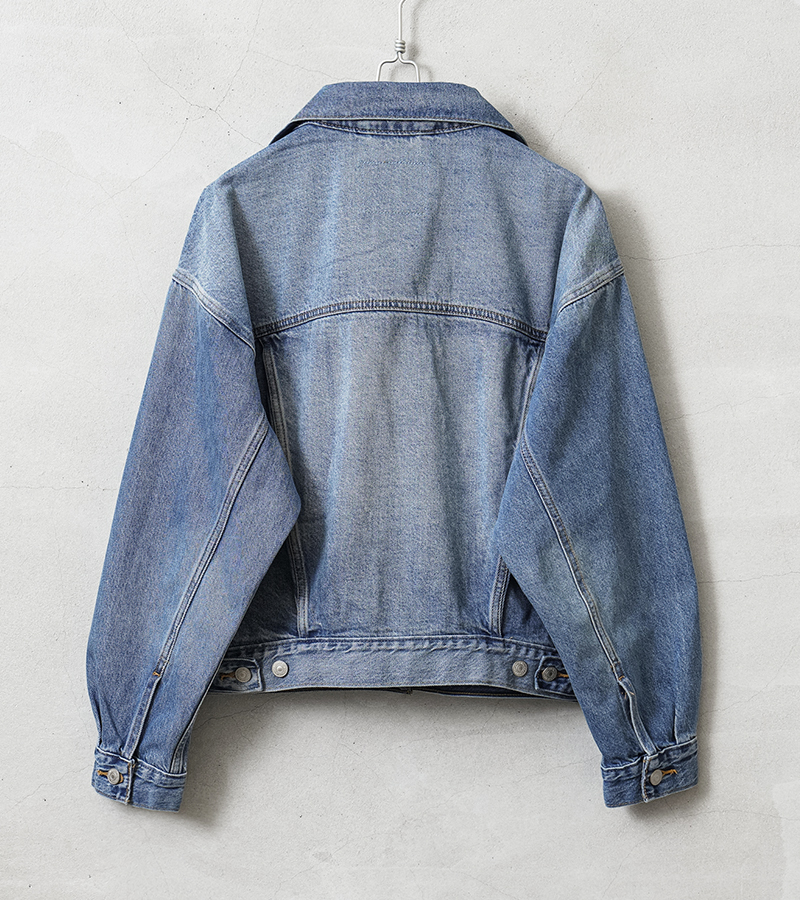 ボディラインに沿ったレトロなカットのシルエットが90年代風の雰囲気を演出するデニムジャケット。明るめのミディアム~ライトインディゴで、爽やか&抜け感のある印象。ややボックス型のゆったりシルエットで、流行に左右されにくい定番デザインはハードすぎず、クリーンでキレイ目カジュアルな着こなしも可能になっています。シンプルながら両胸のフラップポケット、サイドウエストアジャスターなどジーンズブランドならではの拘りのディテールも健在。パンツスタイルにはもちろん、ワンピースの上に羽織ったり、ヒールを合わせたりと女性ならではのコーディネートにも取り入れやすいデニムジャケットは、ストリートにも上品にも振れる“使いやすい一着”。 同じカラーのボトムスと合わせてセットアップが完成します。
