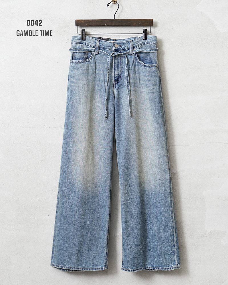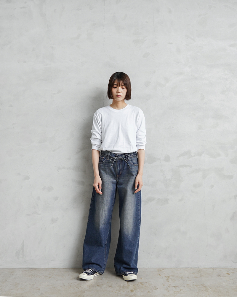 オーバーサイズのバギーシルエットと幅広のストレートレッグを取り入れたデニムパンツ。着脱しやすいフロントジッパーフライで、丈夫な綿の特徴は残しつつ肌馴染みの良い柔らかさのある生地。さらにアクセントにもなる調整可能なウエストバンドを備え、ハイライズ、ミッドライズ、ローライズなど好みのフィット感に合わせて着こなせます。脚長効果が期待できるストンと落ちる直線的なシルエットで、お尻や太ももまわりが少し気になる方でも動きやすく美しいシルエットを実現。 身体のラインを拾わないワイドな直線シルエットと落ち着いた色合いは、こなれ感とアーバンヴィンテージな雰囲気が漂います。