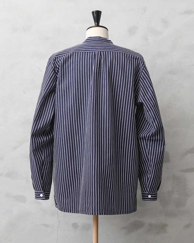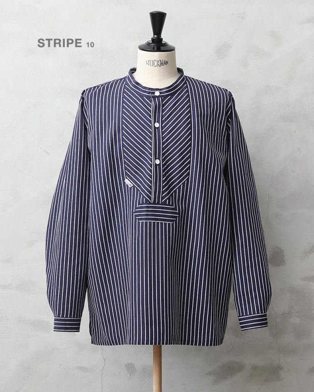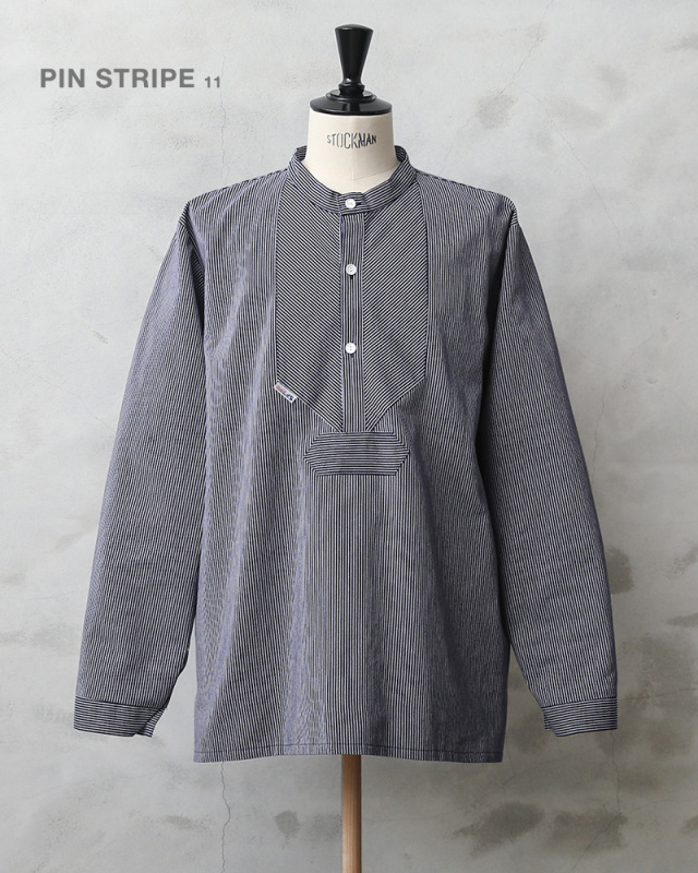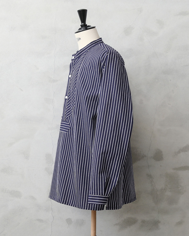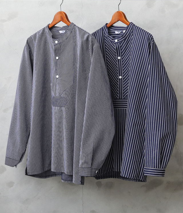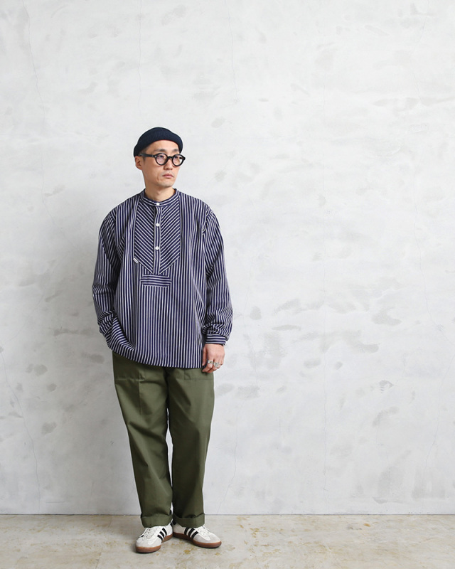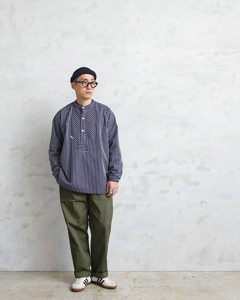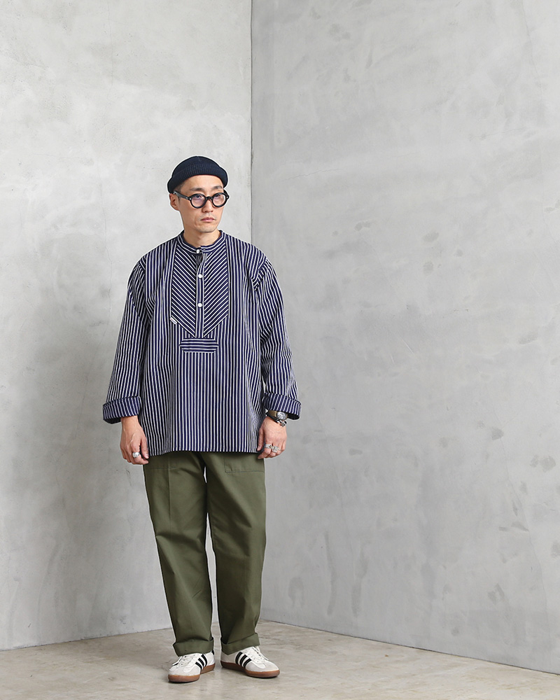 | 商品説明 | modAS モダス フィッシャーマンシャツのご紹介です。 品番:1000 modAS モダスはフィッシャーマンシャツを製造する代表的なブランドで、フィッシャーマンや海洋、海事に関連する人々のワークウェアを手がけています。 伝統的なフィッシャーマンシャツはドイツのフィンケンヴェルダーの漁師たちが一目で漁師と分かるような作業着を作ろうと丈夫な生地を使って縫ったのが始まりとされています。その使い勝手の良さ、丈夫さから様々な職種の人々にもワークウェアとして着られるようになり、現在では普段着としても愛用されるようになった快適で伝統的なプルオーバーシャツです。 程よいリラックス感を与えるバンドカラーの襟元に身幅は広めにデザインされたボックスシルエット、フロントの切り替えデザインが独特で首元は生地を横使いすることで補強の役割も果たす計算されたディテールで、サイドにはスリットが入っています。3つのボタンで開閉するプルオーバーで非常に雰囲気のある一枚です。 程よく厚手の綾織りのコットンを使用した肌触りの良い素材感でネイビー×ホワイトのストライプ柄はピンストライプとストライプの2種類があり、お好みでセレクトして下さい。 古くから愛されているトラディショナルなデザインが魅力のフィッシャーマンシャツです。 |