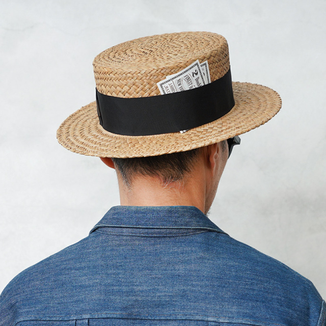 品名:BLACKY BOB 品番:5235002 Mr.FATMANが打ち出すハットライン“J.J. WILLIAMS”の人気モデル。通年を通して着用可能のクラシックなカンカン帽です。 上質で目の詰まった天然草木素材を採用。空気層を多く含んでおり、熱を遮断し、通気性よく快適です。 また高い紫外線カット効果はもちろん吸湿性も高いのでオールシーズン着用可能です。 クラウンは平らの円筒形。水平についたブリムも特徴的。 スタンダードで万人に合うすっきりとしたフォルムながら、リボンのコントラストが効いた逸品です。 クラシカルなハットに、太めのグログランリボンが上品なアクセント。メタルタグ付きで、右後部には2ドル札を模した紙幣カタログフラッシャーが挟み込まれており一癖あるデザインに仕上がっています。 確かな技術とこだわりで作られた日本製でパナマハットとは違った光沢感と上品さを持ち合わせた天然草木でできたカンカンハット。 スーツやキレイ目のジャケットに合わせれば、紳士のスタイルに。カジュアルスタイルの外しとしても、他とは差がつく優秀アイテムです。 MADE IN JAPAN |