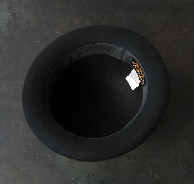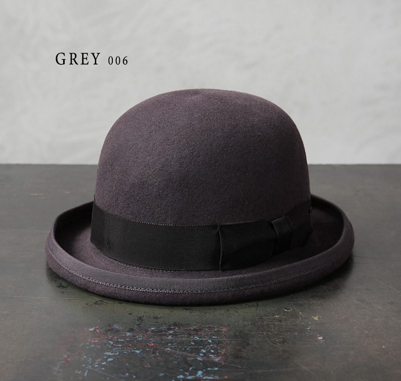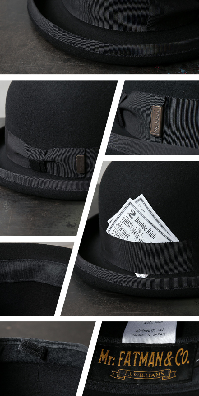 Mr.FATMANが打ち出すハットライン“J.J. WILLIAMS”の人気モデル。ヴィンテージ・ヘリテージスタイルとの相性が良い、クラシックなボーラーハットです。上質で滑らかな目の詰まったウールフェルト素材を採用。美しい丸いフォルムに、ブリムは弓形のペンシルカール仕立てで丁寧にパイピングが施されています。クラシカルなハットに、太めのグログランリボンが上品なアクセント。メタルタグ付きで、右後部には2ドル札を模した紙幣カタログフラッシャーが挟み込まれており一癖あるデザインに仕上がっています。
