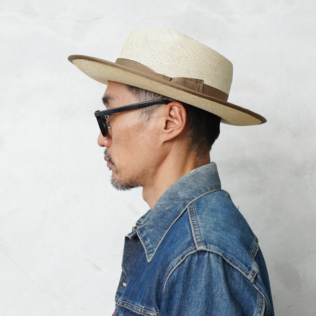 品名:JAY 品番:5251507 Mr.FATMANが打ち出すハットライン“J.J. WILLIAMS”の人気モデル。単調になりやすい春夏ファッションにアクセント抜群のクラシックな中折れ帽です。 上質で目の詰まった天然草木素材を採用。空気層を多く含んでおり、熱を遮断し、通気性よく快適です。 また高い紫外線カット効果はもちろん吸湿性も高いのでオールシーズン着用可能です。 クラウンは前後にかけて高低差があるティアドロップ型。ゆるやかにカーブしたブリムには、ポイントとなるパイピングが丁寧に施されています。 スタンダードで万人に合うすっきりとしたフォルムながら、リボンやパイピングのコントラストが効いた逸品です。 クラシカルなハットに、太めのグログランリボンが上品なアクセント。右後部には2ドル札を模した紙幣カタログフラッシャーが挟み込まれており一癖あるデザインに仕上がっています。 確かな技術とこだわりで作られた日本製でパナマハットとは違った光沢感と上品さを持ち合わせた天然草木でできたフェドラハット。 スーツやキレイ目のジャケットに合わせれば、紳士のスタイルに。カジュアルスタイルの外しとしても、他とは差がつく優秀アイテムです。 MADE IN JAPAN |