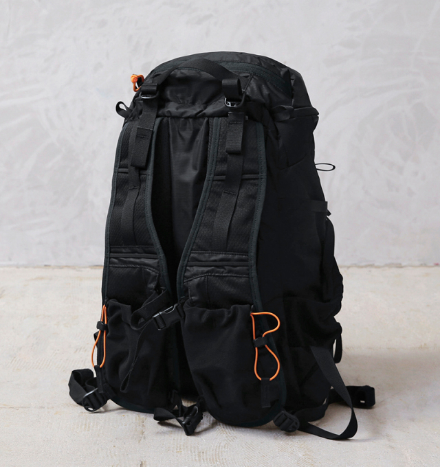 トレイルやアウトドアにかかせないハイドレーションシステムに対応したディテール、収納も大きめのメインコンパートメントだけでなく、キークリップ付きのトップリッドポケットやサイドポケットを装備。薄くメッシュパッドの入った柔らかいショルダハーネスにはペットボトルや携帯電話、サングラスなど取り出す頻度が高い小物などを収納できるポケットを配置。間口にはコードがついているので絞って中身の落下も防止します。