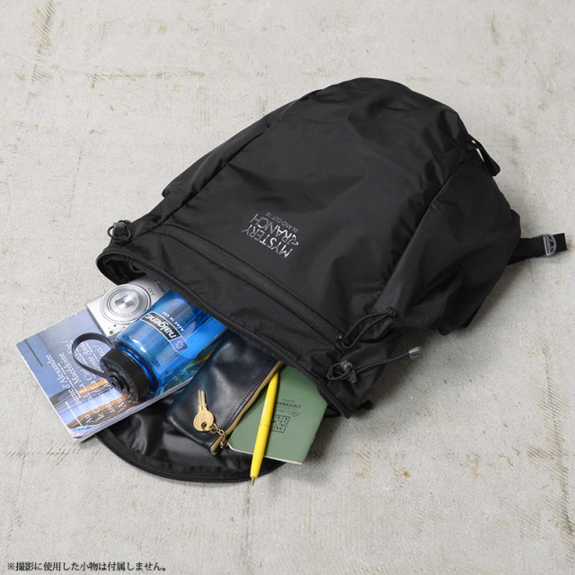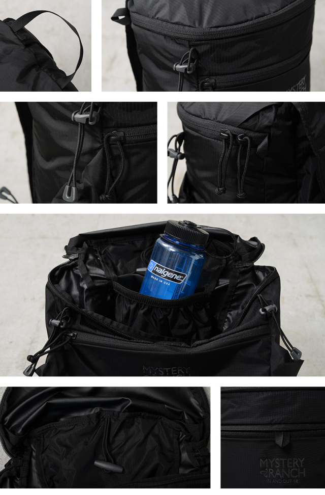 MYSTERY RANCHのインアンドアウト18は、折り畳み式でコンパクトになる軽量なバックパックです。メインコンパートメントはジッパーリッド式で内部にはハイドレーションスリーブが装備され、背面にはハイドレーションポート。両サイドには深型のボトルポケットがあり、ボトル以外にも脱いだアウターなどを入れることができます。フロントのフラットなジッパーポケットに本体を収納でき、持ち運び可能なコンパクトなサイズ感に。キーフープとしても使える、ジッパーポケットの内側のループは、コンパクトに折りたたんだ際には、カラビナなどを付けてメインバッグなどに取り付けできる便利な仕様となっています。