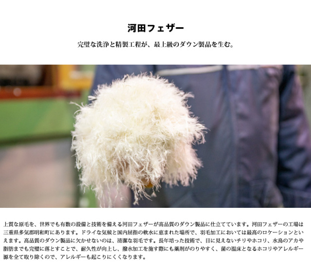 | 素材 | 表地:コットン100% 裏地:コットン100% 中綿:ダウン90%、フェザー10% |
