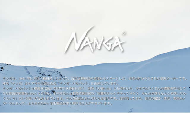 | ブランド | ![]() ナンガは、1941年に先代「横田晃」によって、近江真綿布団の産地からスタートした、羽毛の町から生まれた寝袋メーカーです。社名「ナンガ」はヒマラヤ山脈にある「ナンガ・パルバット」に由来しています。ナンガ・パルバットは標高8126mで世界で9番目に高く、別名「人喰い山」とも恐れられ、今までにたくさんの遭難者を出してきた登頂が困難な山のことを指し、その社名には創業者横田晃の「困難だからこそやってやろう、みんなが登らんとこを登ったろうという」という思いが込められています。そのNANGAのこだわりは羽毛です。長年培ってきた、羽毛の選定・洗毛・管理のノウハウによって、よりあたたかい羽毛製品を作り続けることができています。 その他のNANGA ナンガはこちら |
