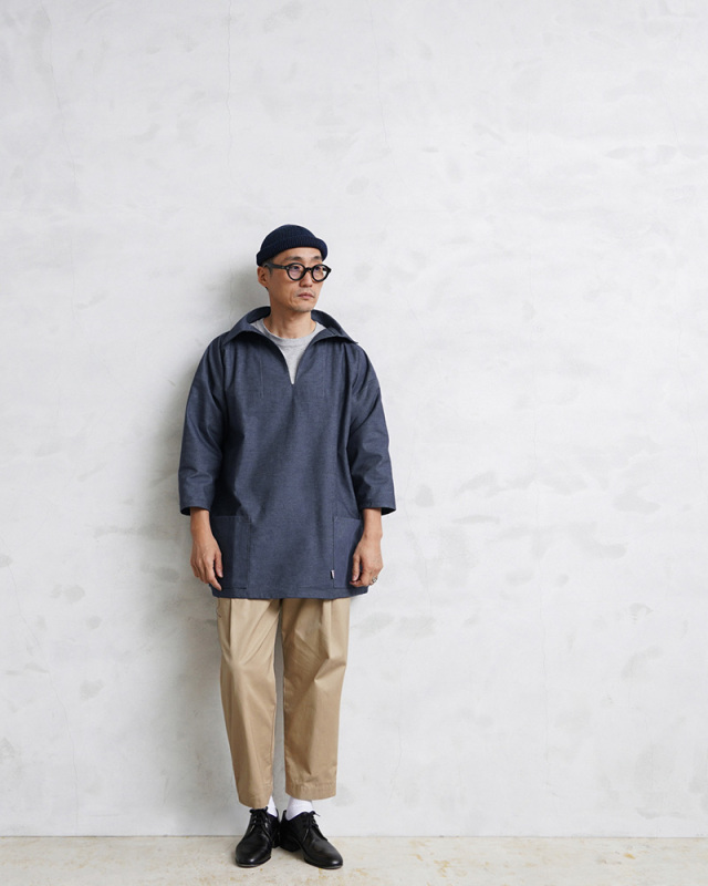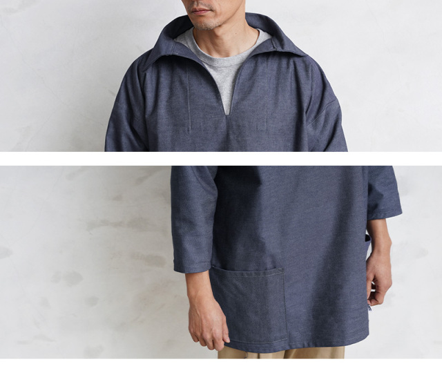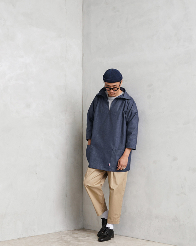 Newlyn Smocksより、しっかりとした生地感と特徴あるシルエットのフィッシャーマンズスモックから七分袖が登場しました。 古くから漁師たちに、エプロンの代わりや防寒の為の羽織りとして愛用されているフィッシャーマンズスモック。生地にはワークウェアでお馴染みのデニム素材を採用。繰り返し洗濯をしてもへたることなく、着込めば着込むほどに馴染んでいくので、着心地だけでなく雰囲気の変化も楽しめます。 首元はボリュームがあり、広く開いたVネックのスキッパー仕様。ワークウェア特有のオーバーサイズなボックスシルエットが存在感のあるデザインです。フロントのパッチポケットも収納力があり便利な仕様です。 特徴的なボックスシルエットにシンプルなデザインはボトムスを選ばないので、アメカジやアウトドア、キレイめなコーディネートまで幅広く合わせられる万能アイテムです。 MADE IN UK |