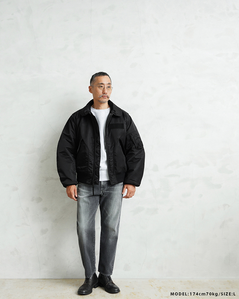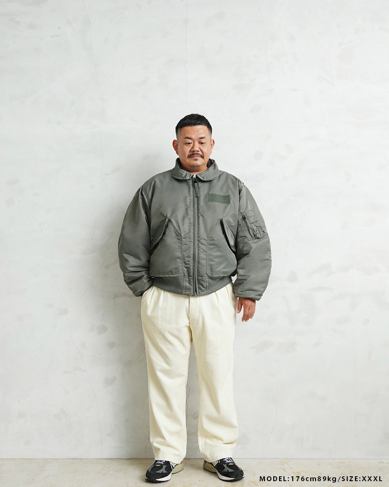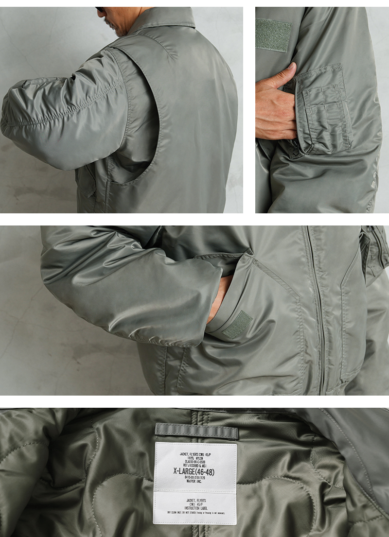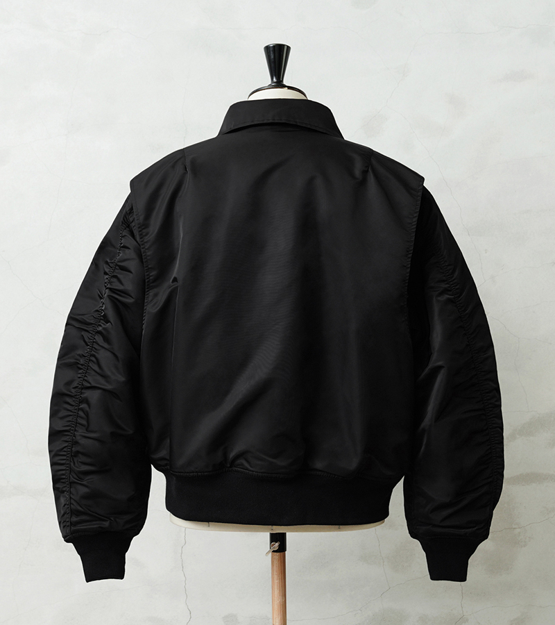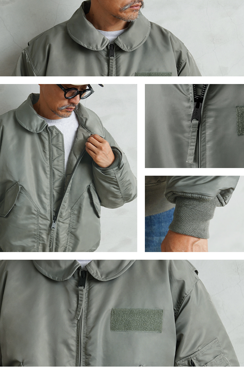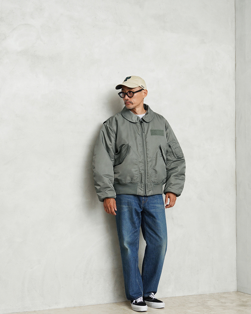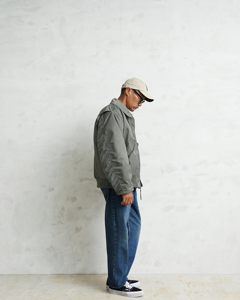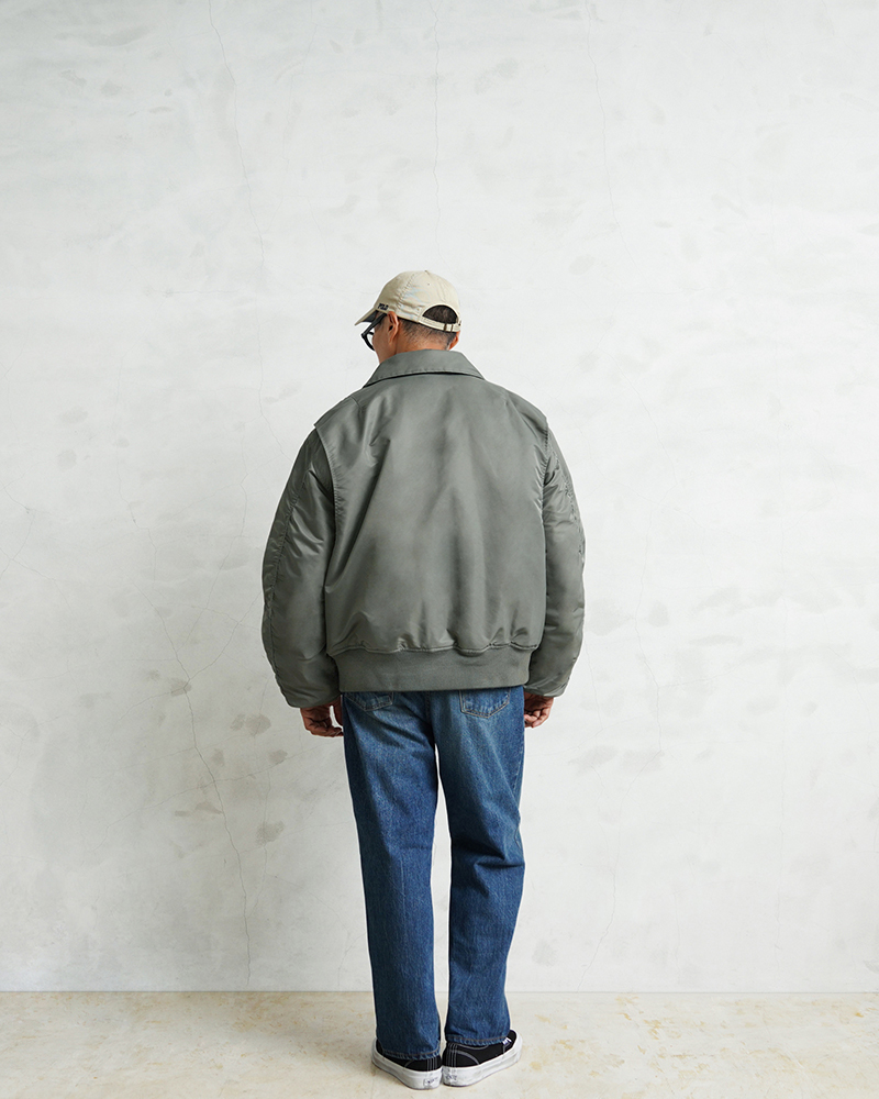 WAIPER.incではより普段着として着用しやすいようにMA-1にも採用された、肉厚のしっとりとしたナイロンツイルを使用することでアレンジを加えさせていただきました。特徴的なディテールとして、CWUのポイントである背中のアクションプリーツ。さらに裏地のキルティングは70年代の個体にみられる背中心で接いだバイアスのキルティングを再現しています。