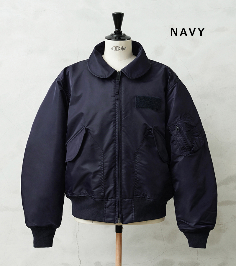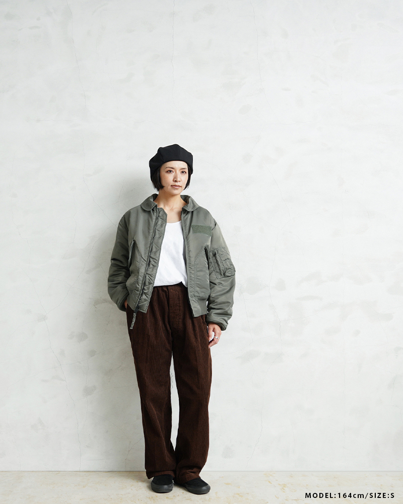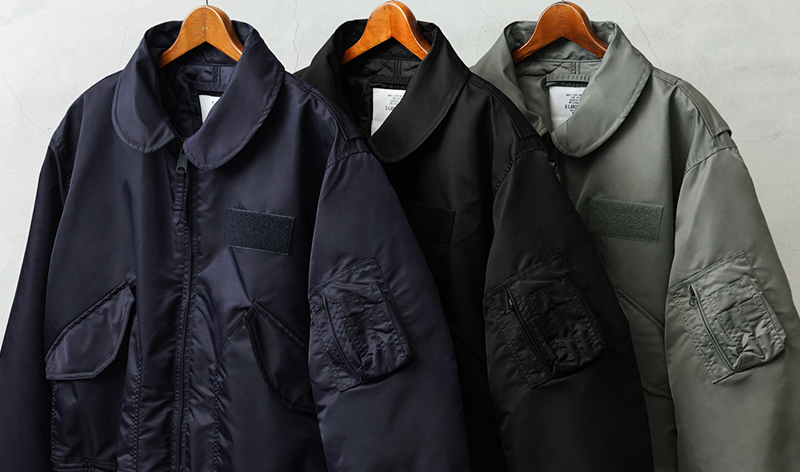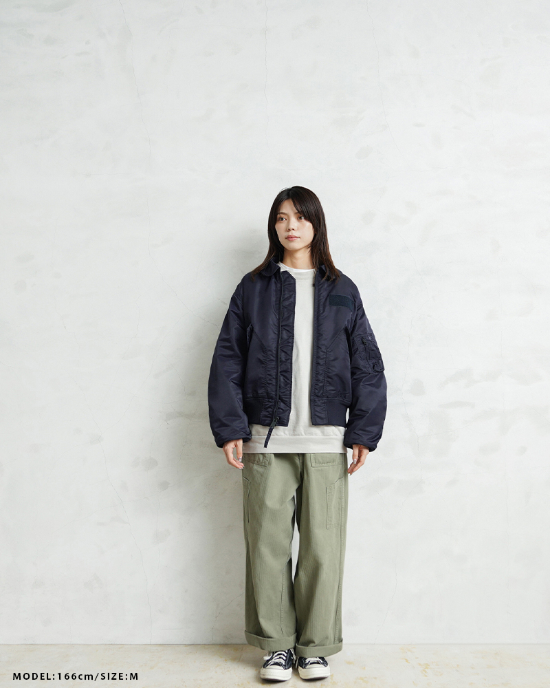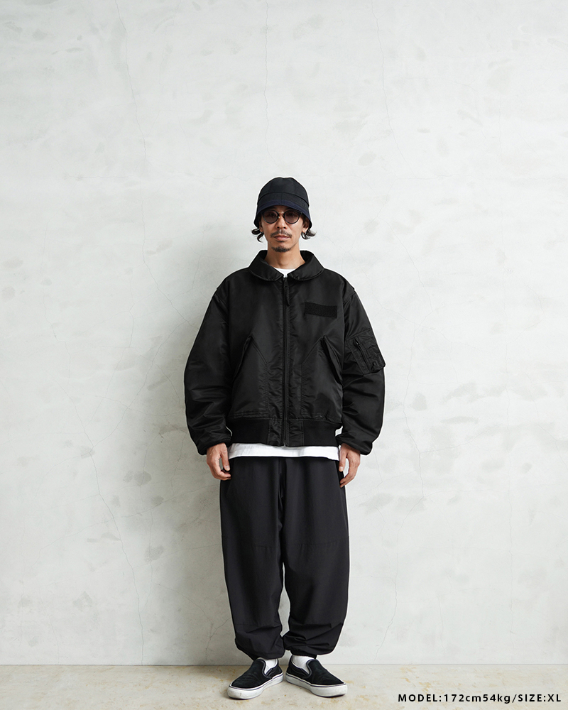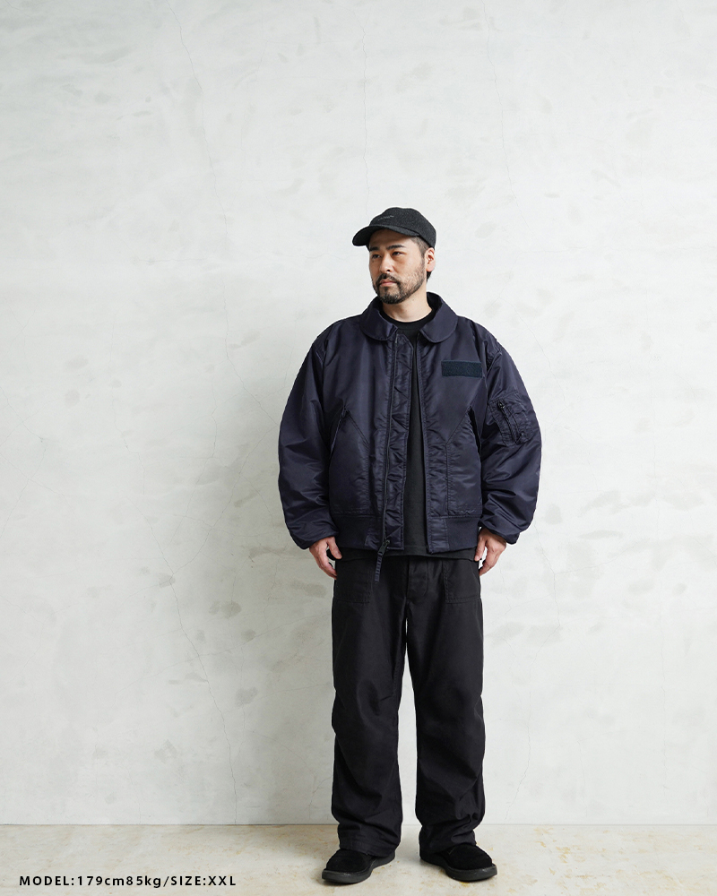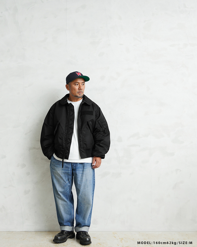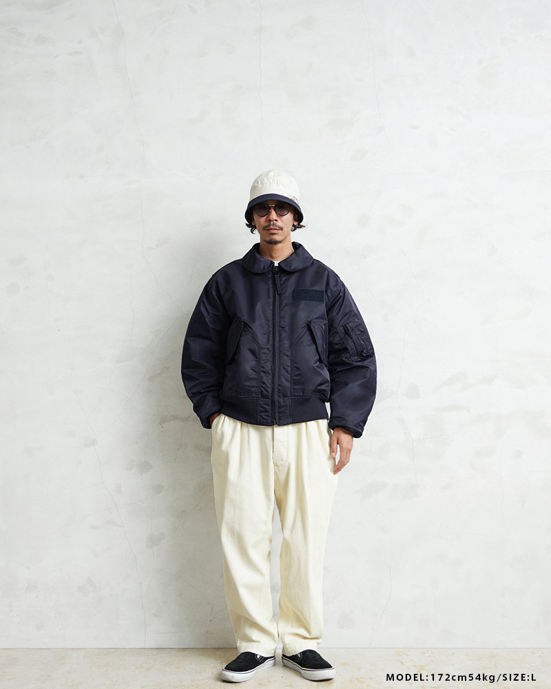 WAIPER.incではより普段着として着用しやすいようにMA-1にも採用された、肉厚のしっとりとしたナイロンツイルを使用することでアレンジを加えさせていただきました。特徴的なディテールとして、CWUのポイントである背中のアクションプリーツ。さらに裏地のキルティングは70年代の個体にみられる背中心で接いだバイアスのキルティングを再現しています。