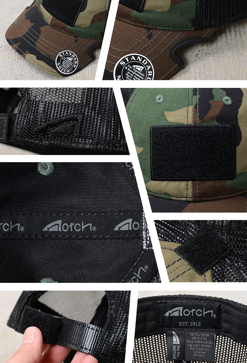 | 商品説明 | Notch Gear ノッチギア Classic Adjustable Operator Camo メッシュキャップのご紹介です。 ブランド独自の革新的なデザイン・ギミックを採用したオペレーターキャップは、バイザーに切り込みを施すというアイデアにより、サングラスなどのアイウェアをかけた状態でも帽子を深くかぶることが可能です。 また、切り込みを保護している樹脂製パーツは柔軟性に長けている為、、着用するアイウェアの形状に合わせてフィットするようにバイザーを調整して頂くことが可能です。 素材にはリップストップとメッシュを使用。フロントにはミリタリーワッペンなどを取り付けることが可能なベルクロパネルが施されています。 背面のベルクロアジャスターによってサイズフリーで着用いただけます。 日常使いはもちろんアウトドアアクティビティーなどにも使えるオススメのキャップです。 |