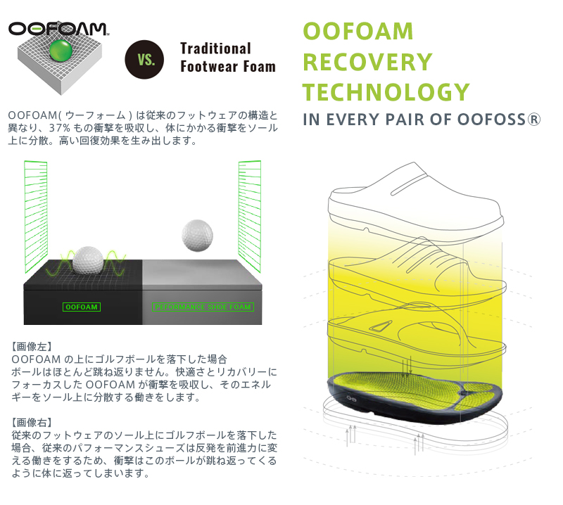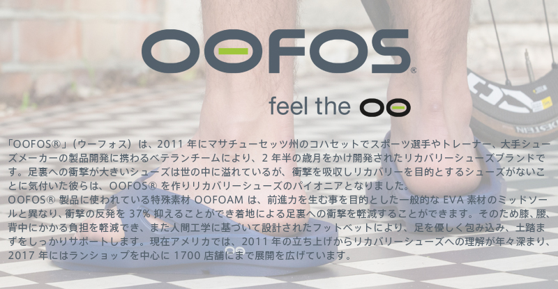 | ブランド | ![]() OOFOS製品に使われている特殊素材「OOfoam」は、前進力を生む事を目的とした一般的なEVA素材のミッドソールと異なり、衝撃の反発を37%抑えることができ着地による足裏への衝撃を軽減することができます。そのため膝、腰、背中にかかる負担を軽減でき、また人間工学に基づいて設計されたフットベットにより、足を優しく包み込み、土踏まずをしっかりサポートします。現在アメリカでは、2011年の立ち上げからリカバリーシューズへの理解が年々深まり、 2017年にはランショップを中心に1700店舗にまで展開を広げています。 その他のOOFOS ウーフォスはこちら |