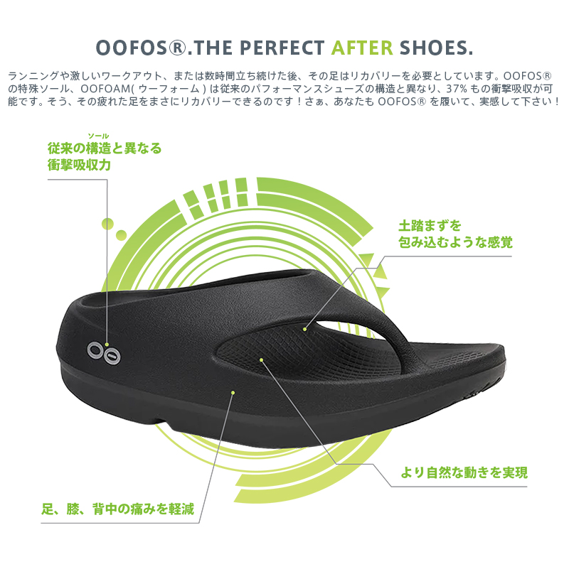 「OOriginal」の次世代モデルであり、「All-day Recovery」の基準を打ち立てる一足です。 ランニングや激しいワークアウト、または数時間立ち続けた後、その足はリカバリーを必要としています。OOFOSの特殊ソール、OOfoam(ウーフォーム)は従来のパフォーマンスシューズの構造と異なり、37%もの衝撃吸収が可能。疲れた足をしっかりリカバリーしてくれます。 OOfoamはEVAシューズのように型崩れをすることが無く、地面と足裏にぴったりと寄り添う働きをします。結果、一般的なアウトソールによく見られる摩擦も起こしにくく、本体寿命を延ばす効果もあります。 土踏まずを包み込むような感覚で、より自然な動きを実現。足、膝、背中の痛みも軽減してくれます。OOFOSのフットウェアは高密度構造になっており防臭効果も発揮。水に浮く軽量設計です。 スポーツ後はもちろんタウンユースやレジャーなどにも使いやすいベーシックデザイン。ぜひこの異次元の履き心地を体感してください。
