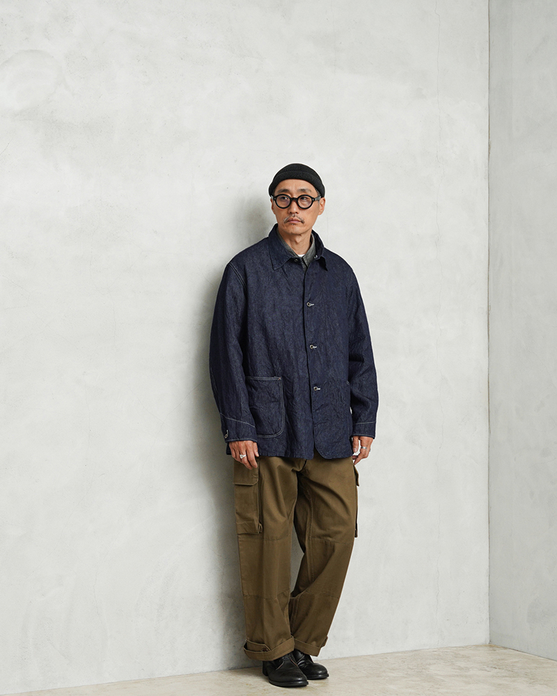 1940年代のワークウェアをベースに、装飾を抑えたミニマルな設計で仕上げられたカバーオール。フロントには中央に穴の開いたドーナツボタンを採用し、大戦期らしいディテールを踏襲しています。ゆとりのあるシルエットと計算されたバランスにより、現代のスタイリングにも自然に馴染む一着です。