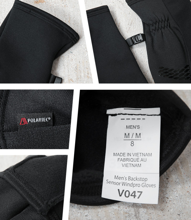 | 素材 | 手の甲:bluesign® 認定 Polartec® Wind Pro® フリース 97%、ポリエステル 3%、スパンデックス 手のひら部分:Radiant Fleece™95% ポリエステル 5%、スパンデックス |