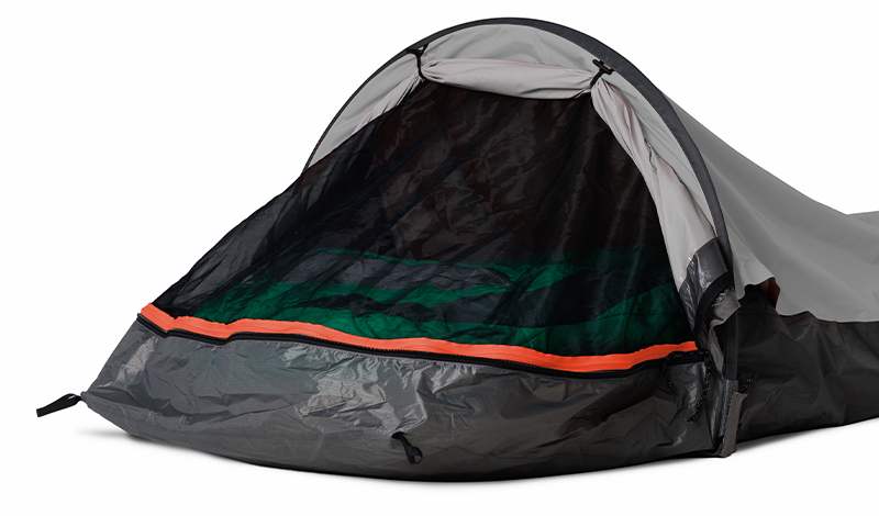 Helium UL Bivyは、ウルトラライト志向のバックパッカーやクライマー、ファストパッカーに向けた防水ビビィ。テントを設営できない稜線や岩場、限られたスペースでのビバークに対応するミニマルな構造ながら、確実な防水性と通気性を備えています。 アッパーにはbluesign認証のPertex Shield NetPlus(100%リサイクルナイロン30Dリップストップ/2.5レイヤー構造)を採用。 軽量性と防水透湿性を両立し、フルシームテープ処理により雨水の侵入を防ぎます。フロアは40DナイロンリップストップにPUコーティングを施し、地面からの水分を遮断します。