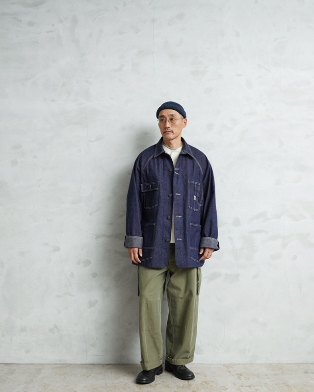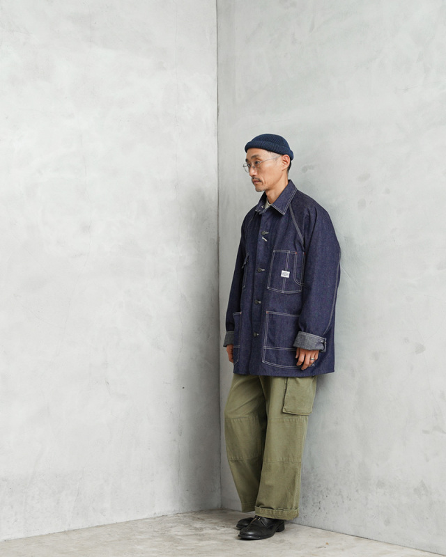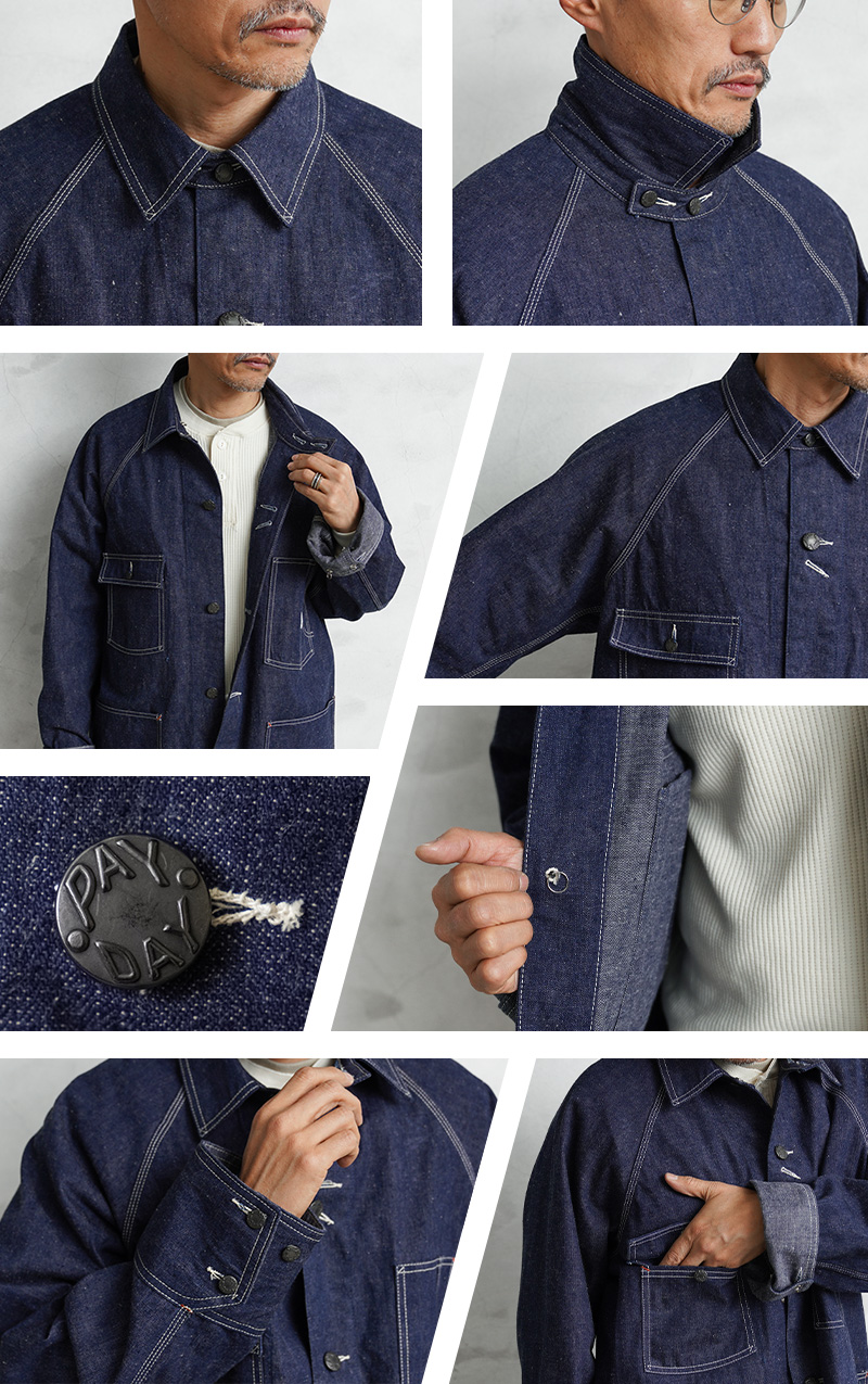 PAYDAY ペイデイからデニム素材をベースにした丈夫で経年変化を楽しめるカバーオールが登場しました。素材にはハリとザラつきをしっかり残した生デニムを使用。着始めは硬さがありますが、着用と洗いを重ねるほどに体へ馴染み、着用を重ねるほどに生地が柔らかくなり、縦落ちやアタリ、パッカリングなど、ヴィンテージ特有の豊かな経年変化を楽しめるのも特徴です。