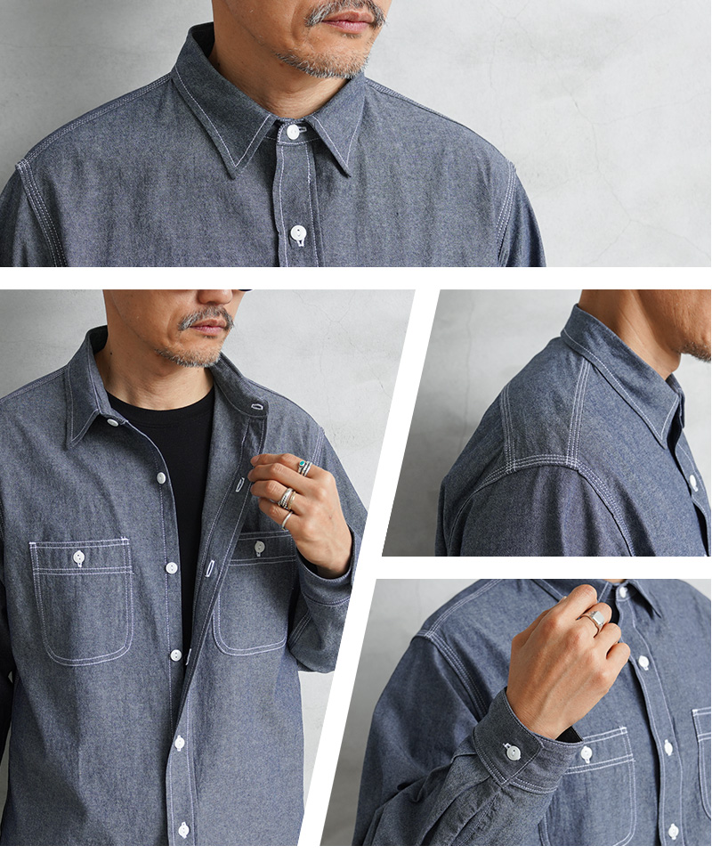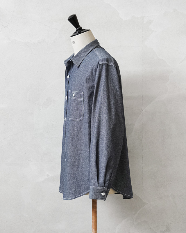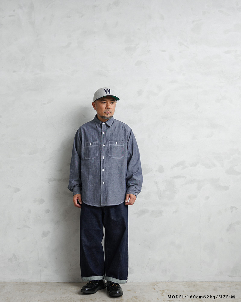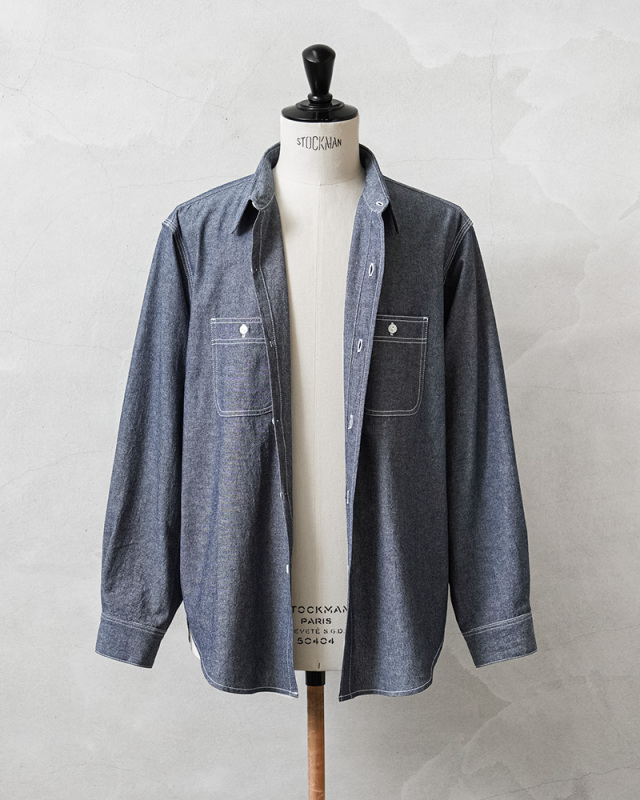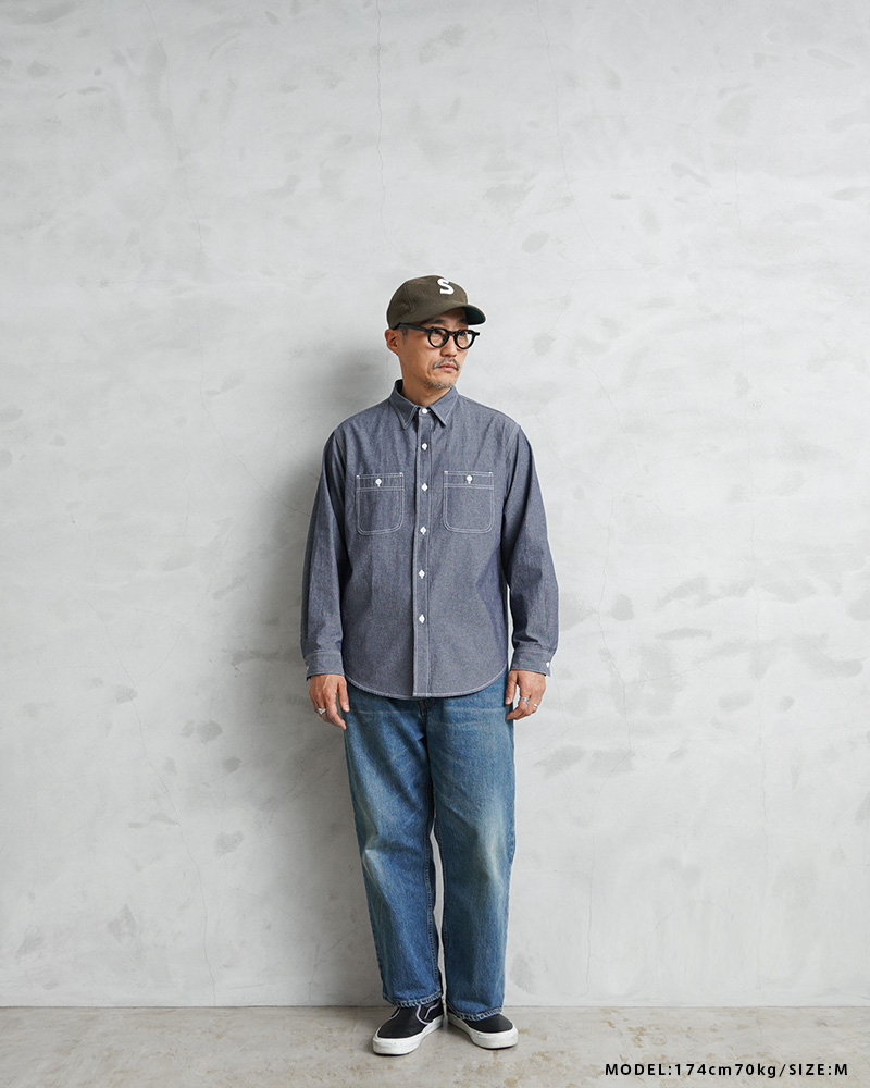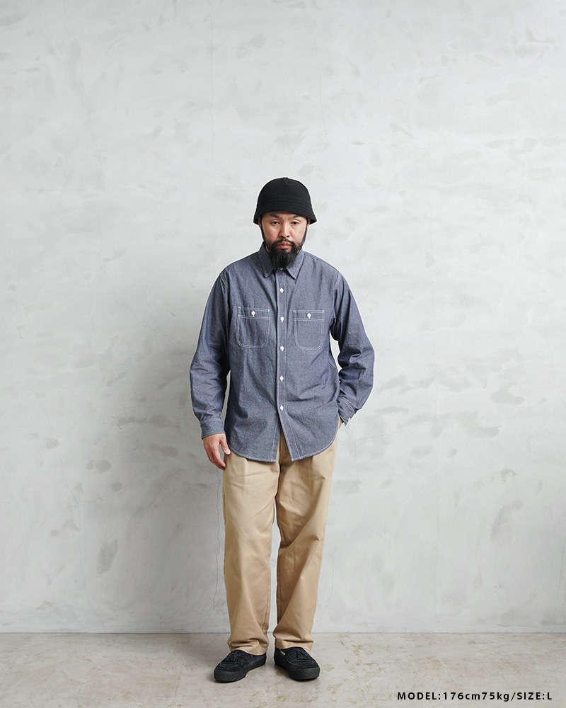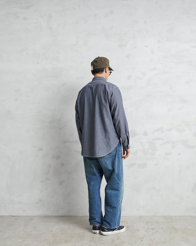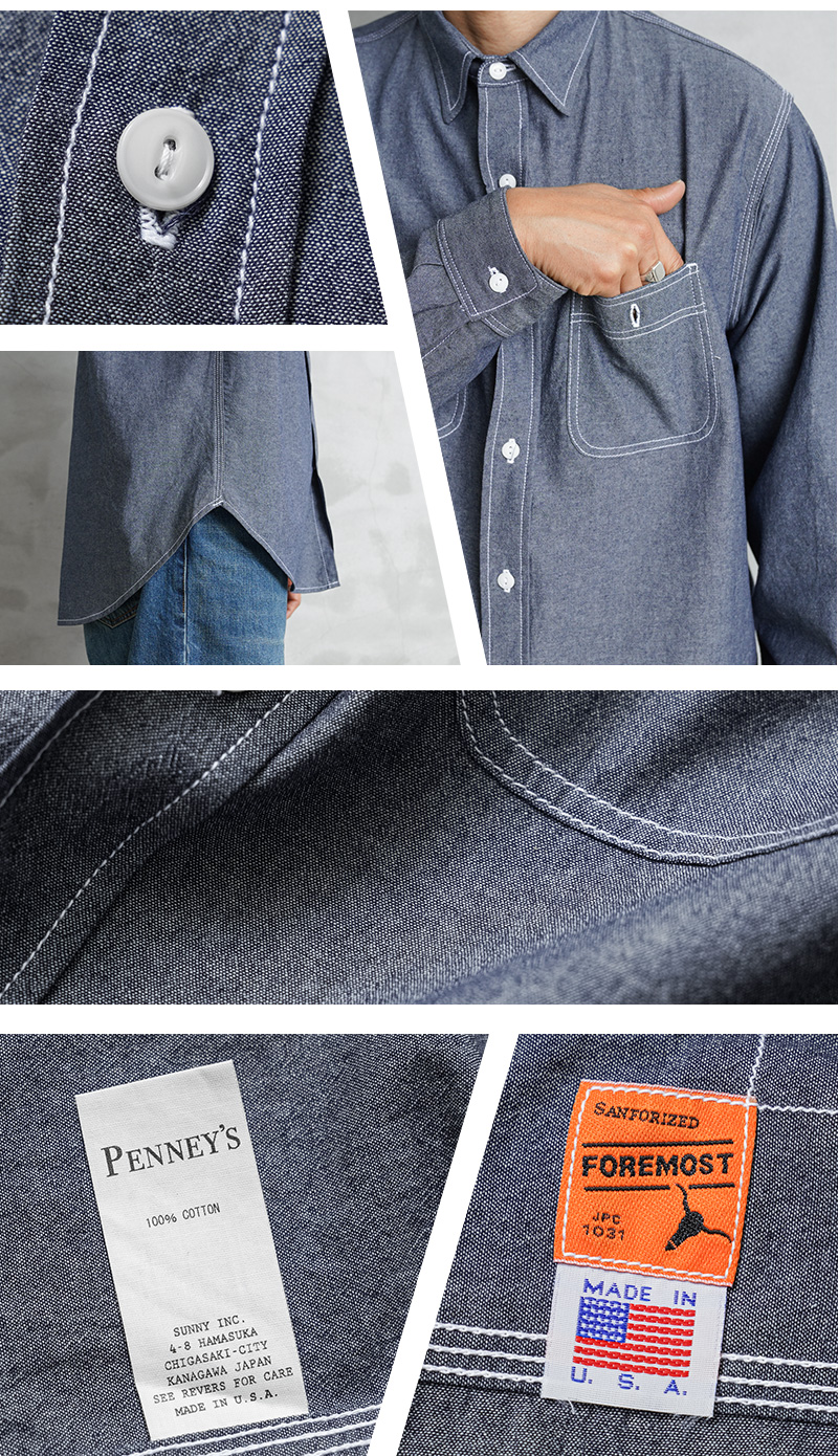 「本物志向」のブランドとして高く評価されているPENNEY’S FOREMOSTから、1960年代のワークシャツがリプロダクションされて登場。ヴィンテージのデザインを踏襲しつつも全く新しいプロダクトとしてアップデートを遂げた一着となっています。当時の無骨なシルエットを参考にしながら、ユニオンスペシャルの3本針巻ミシンを中心にアメリカはロサンゼルスの工場で生産。タグやポケットなど、当時のシャツをイメージして小ぶりな襟とリラックスフィットで仕上げています。