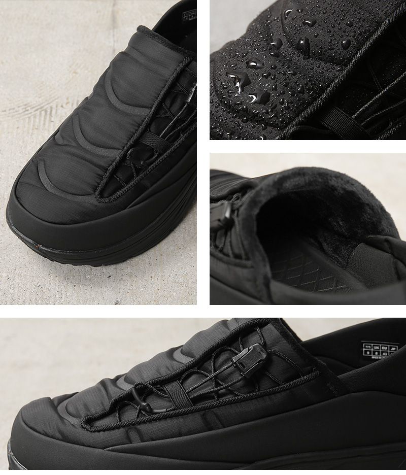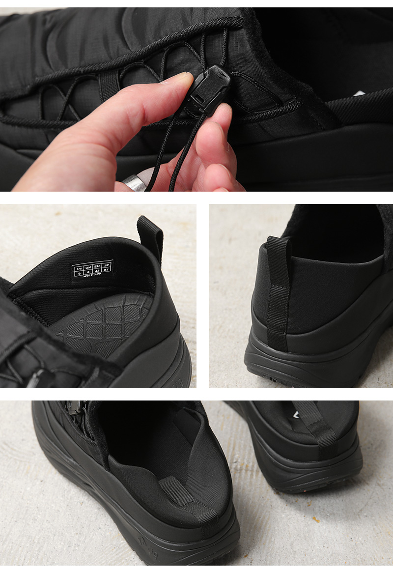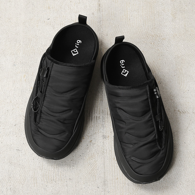 ウィンタースポーツを楽しむ人のために開発された冬用リカバリーシューズ。 rigは日本生まれのリカバリーシューズとして、日本人の足の特徴である「甲高・幅広」に重点をおき日本人にとって快適な履き心地を研究しました。撥水加工されたアウター生地の化繊ダウンと保温性の高いインナー生地を使用し血行を促進。また、生地間に防水透湿フィルムを採用し防水仕様となっています。アッパーには中綿入りのナイロン素材。脱ぎ履きしやすいスリッポンタイプで、片手でフィット感を調整できるサイドのドローコードがほど良いアクセントになっています。シンプルかつボリューム感のあるフォルム。軽量でありながら高い保温性を発揮し、まるでダウンのように足を包み込む履き心地が癖になる秋冬に備えて置きたい一足です。