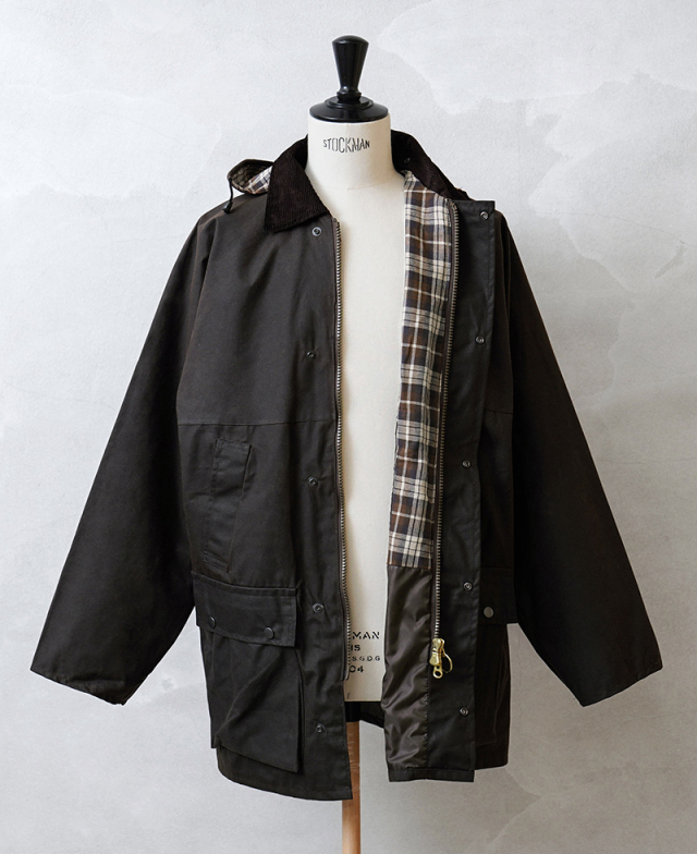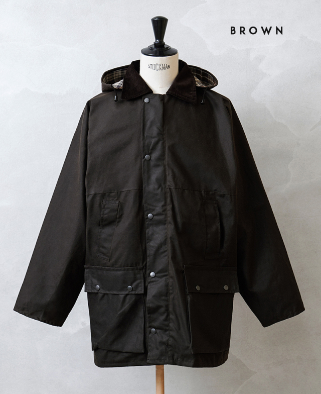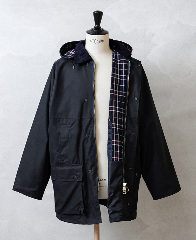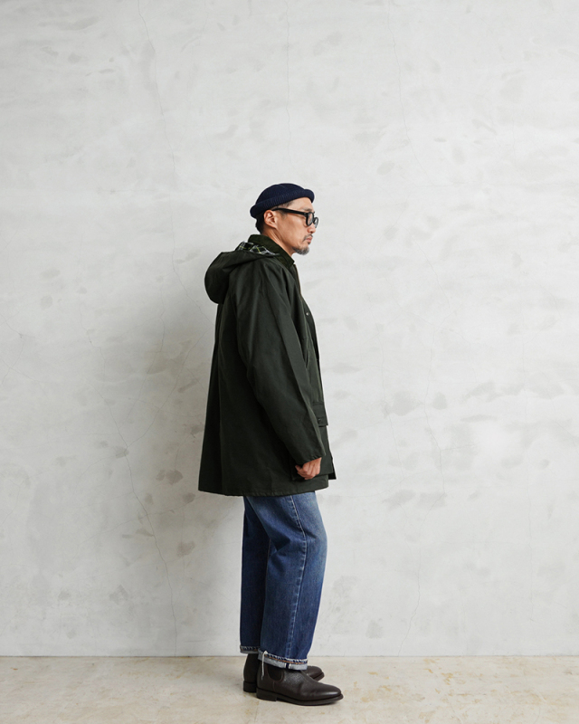 ワックスドジャケットとは、表面にワックスコーティングを施し生地の防水性・防風性・保温性を高めたアイテム。着用を重ねることで、ワックスコーティングが乾き、独特の深い風合いへと変化していきます。 裏地にはシンプルで深みのある表地とは反対に、ボディごとに色合いの異なるイギリスらしいチェック柄を採用することでクラシカルな印象を与えます。 襟元には太畝のコーデュロイ、フラップ付きポケットの上に配置されたハンドウォーマーポケット、フロントの2WAYリングプルジップなど魅力的なディテールが詰まっています。またボタンで取り外しのできる同じくワックスコーティングを施したフードや、袖口の内側に厚みのあるリブを配置することで冷気の侵入を防ぎ防寒性も高めています。
