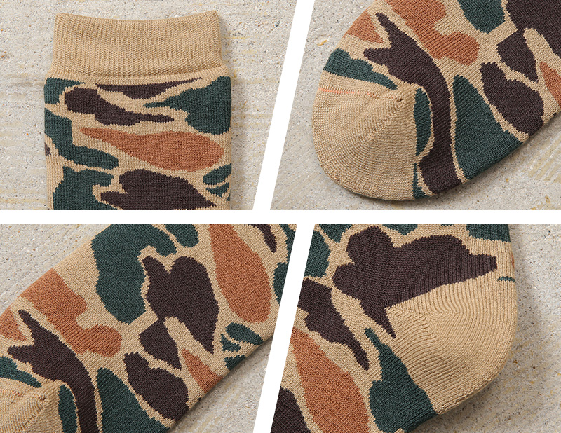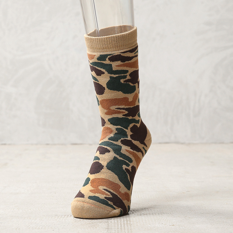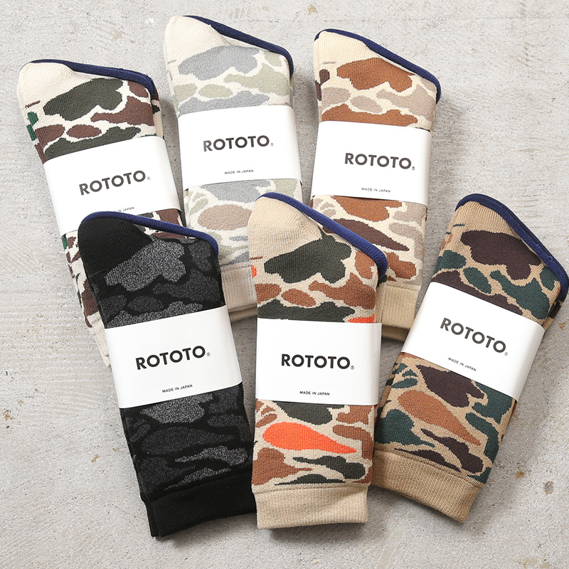 ROTOTOより、落ち着いた迷彩柄が特徴的なクルーソックスが登場です。素材には、上質なコットンを使用。やさしい肌触りと高い吸湿性・保温性を兼ね備えており、オールシーズン快適に着用可能です。またナイロンやポリウレタンを混紡することで耐久性とフィット感があるのも嬉しいポイントです。足底だけではなく、内側全てにパイル編みが施されており、優しい肌あたりはもちろん、高いクッション性もあるので、長時間の歩行も疲れず安心です。