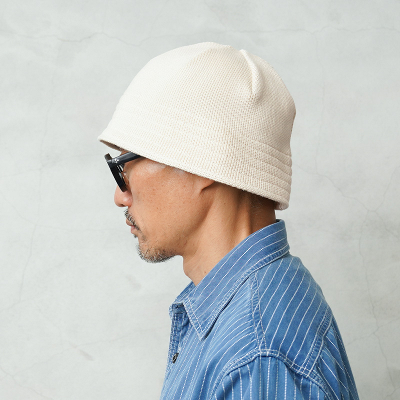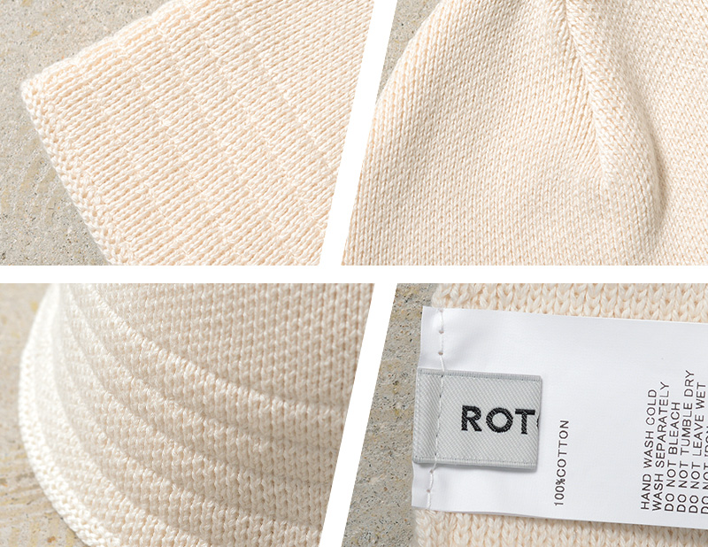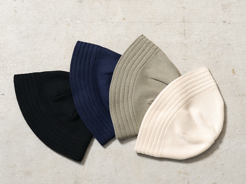 ROTOTOより、セーラーハットのデザインをベースにした、柔らかく快適な被り心地のニットハットが登場。素材には、オーガニックコットン100%の糸を使用。コンパクト紡績という特殊な紡績方法により、毛羽立ちを抑え、さらりとした清潔感のある肌触りに仕上げられています。コットン素材ながら適度な厚みとしなやかな弾力があり、シルエットを綺麗に保ちながらも、心地よく頭にフィットする絶妙なバランスを実現しています。