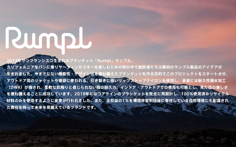 | ブランド | ![]() 2013年サンフランシスコ生まれのブランケット「Rumpl」ランプル。カリフォルニアをバンに乗りサーフィンやスキーを楽しむための旅の中で創設者たちは最初のランプル製品のアイデアが生まれました。今までにない機能性・デザイン性を兼ね備えたブランケットを作る目的でこのプロジェクトをスタートさせ、アウトドア用のジャケットや寝袋に使われる、引き裂きに強いリップストップナイロンを使用し、表面には耐久性撥水加工(DWR)が施され、柔軟な肌触りと信じられない程の耐久力、インドア・アウトドアでの使用も可能とし、見た目の美しさを兼ね備えることに成功しています。2019年にはコアラインのブランケットを完全に再設計し、100%使用済みリサイクル材料のみを使用するように変更が行われました。また、全収益の1%を環境非営利団体に寄付している自然環境にも配慮された責任を持って未来を見据えているブランドです。 その他のRumpl ランプル はこちら |