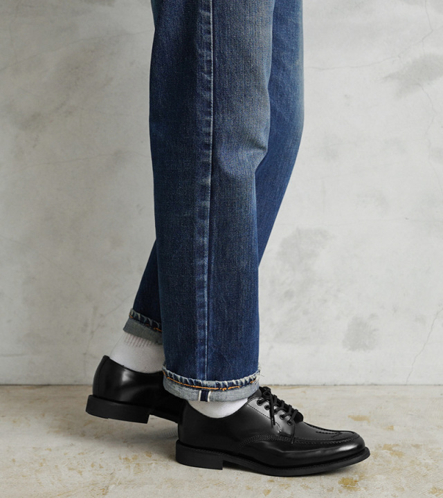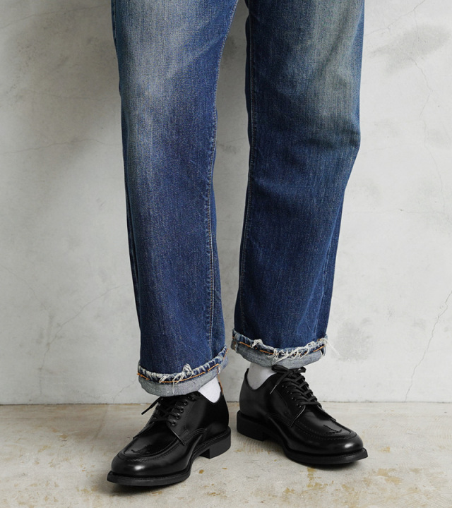 無茶苦茶カッコいい逸品です!ブロードアローも痺れますね。日本の既製品であれば26.5cmをチョイスするのですが、甲高、幅広の自分の足のサイズ感を考慮しUK8をチョイスしました。厚手では難ありですが、革靴用の普通のソックスであれば問題なしです。歩くほどに足に馴染んでくるのが分かります。まずはシューレースはオリーブを装着しカジュアルに履きこなしたいと思います。