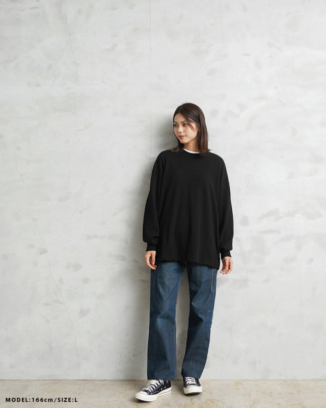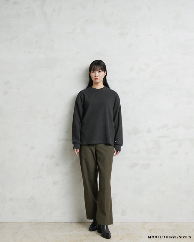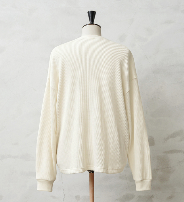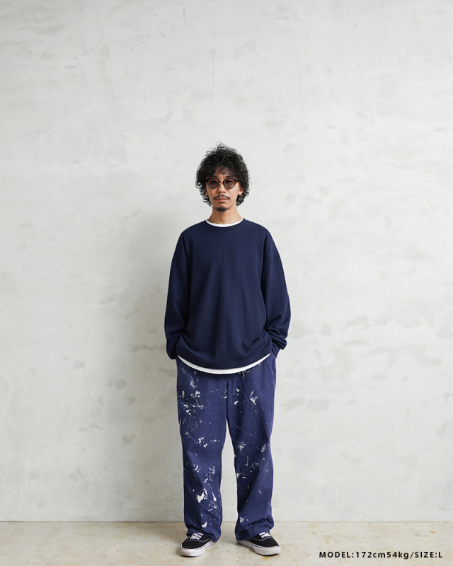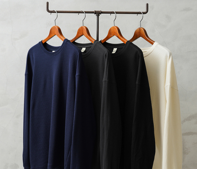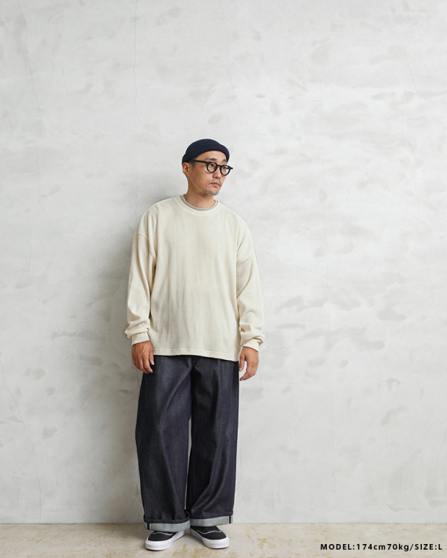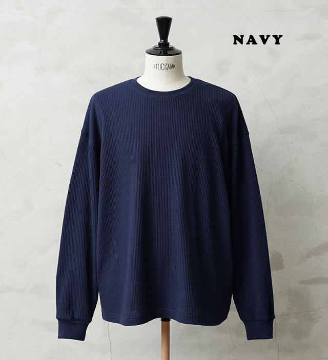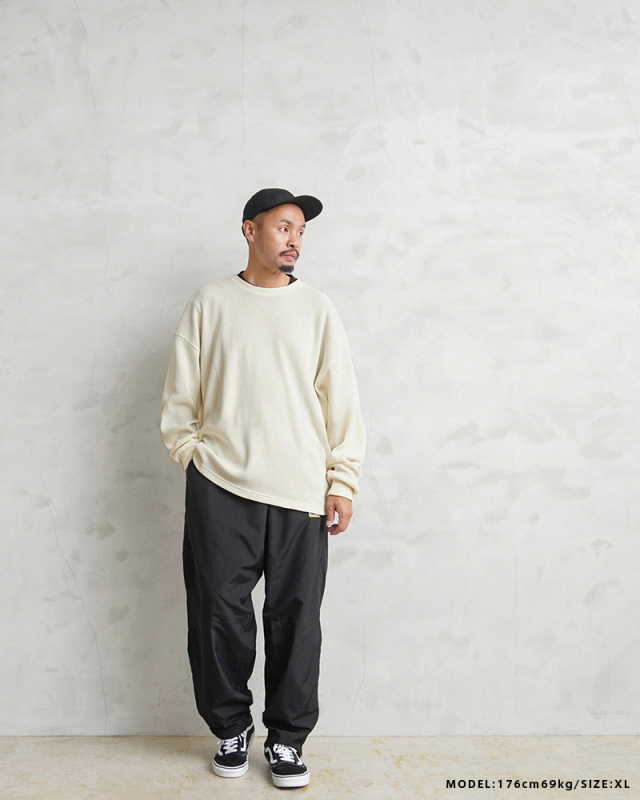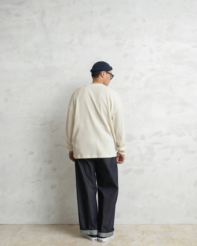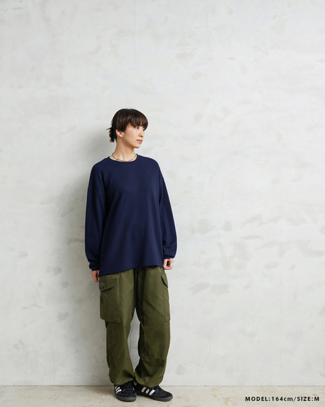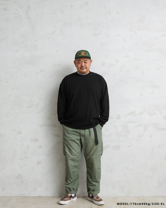 今回はミリタリーアイテムとも相性のいいサーマルTシャツを製作。 ミリタリーのサーマルと言えばハニカムというイメージですが、今回はあえて様々なアイテムと合わせやすいようワッフル生地を採用。 ワッフルのゲージも一般的なものよりもわずかに目を粗くすることでより立体的でカジュアルな印象に。 生地は9ozと程よい厚みがあり、素材にコットン×ポリエステルの混紡素材を使用することにより洗濯時もシワになりにくく、サイズブレなどもあまりないためお手入れが簡単です。 身幅・アームホールにゆとりを持たせた絶妙なボックスシルエットは、着用時のストレスがなく見た目の印象も程よくルーズで、カーゴパンツ・デニム・スラックスなどあらゆるボトムスに合わせやすい1枚となっております。