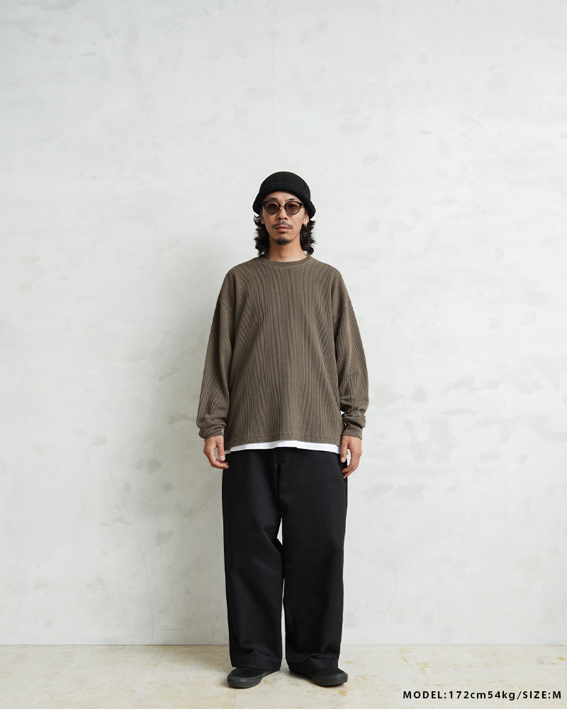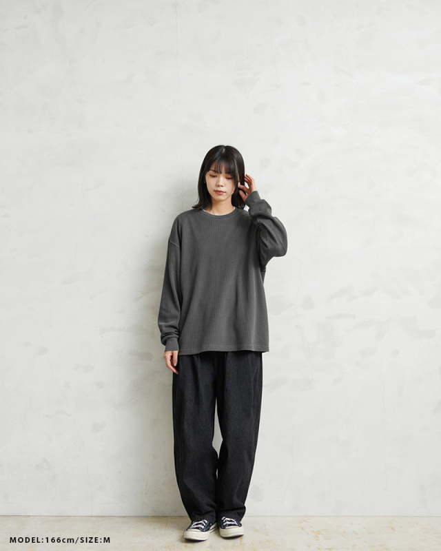 ※染め商品の特性上、一点一点染め上がりのお色やサイズに若干の誤差がございますので予めご了承ください。また、独特のユーズド感のある表情、多少のゆがみや擦れ、縫い目部分のしわ、編み地の筋やムラなどは製品の特徴です。素材の持つ不均一感やラフ感をお楽しみください。