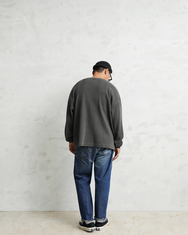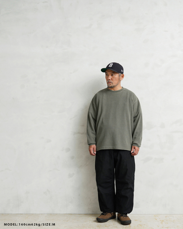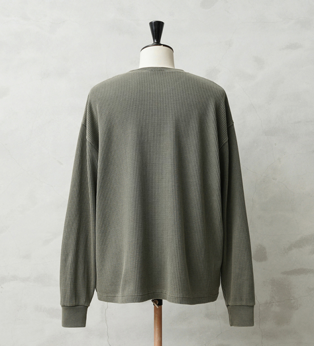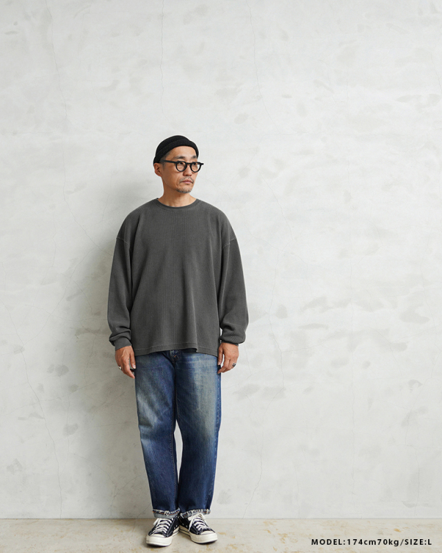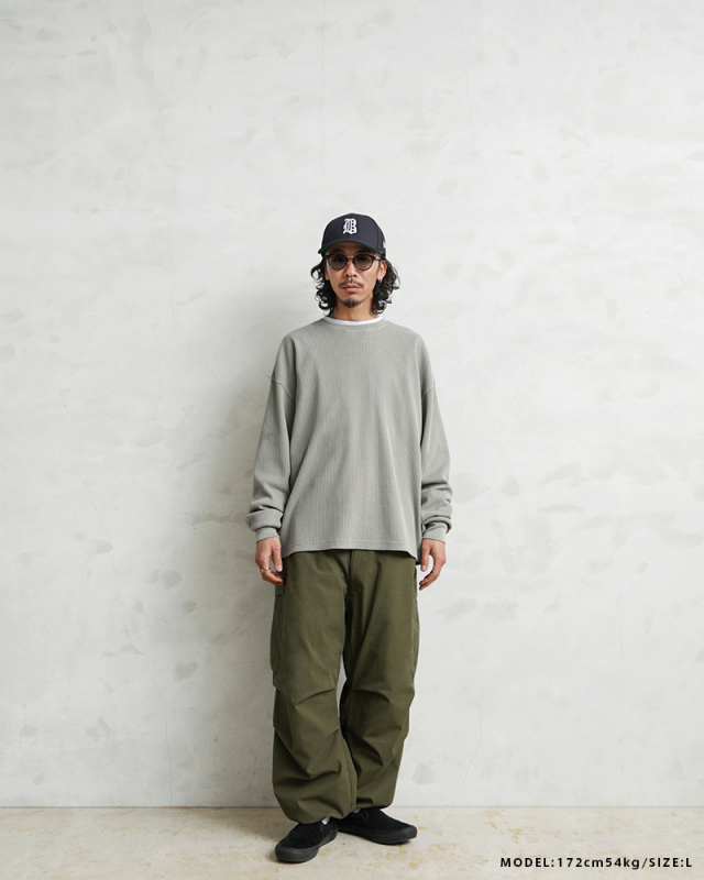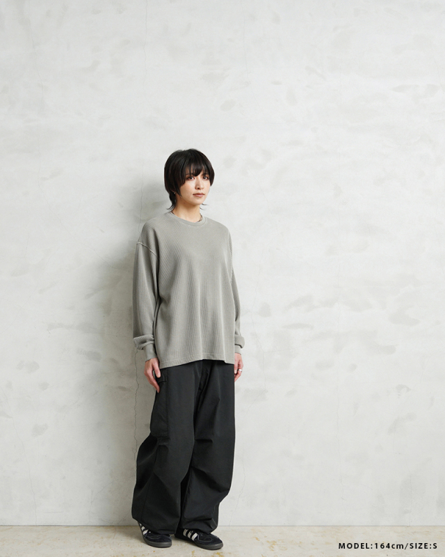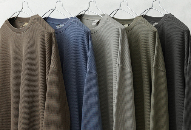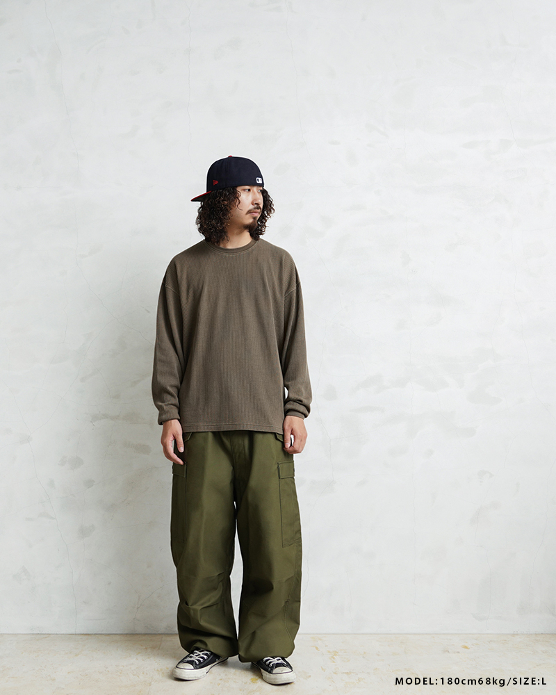| 商品説明 | SCREEN STARS×WAIPER L/S クルーネック サーマル Tシャツ PIGMENT のご紹介です。 品名:L/S thermal T-shirt 品番:2523-455WP ヴィンテージTシャツのボディとしてもファンの多いSCREEN STARSとWAIPERのコラボTシャツが完成しました。 今回はミリタリーアイテムとも相性のいいサーマルTシャツを製作。 ミリタリーのサーマルと言えばハニカムというイメージですが、今回はあえて様々なアイテムと合わせやすいようワッフル生地を採用。ワッフルのゲージも一般的なものよりもわずかに目を粗くすることでより立体的でカジュアルな印象に。 生地は9ozと程よい厚みがあり、素材にコットン×ポリエステルの混紡素材を使用することにより洗濯時もシワになりにくく、サイズブレなどもあまりないためお手入れが簡単です。 身幅・アームホールにゆとりを持たせた絶妙なボックスシルエットは、着用時のストレスがなく見た目の印象も程よくルーズで、カーゴパンツ・デニム・スラックスなどあらゆるボトムスに合わせやすい1枚となっております。 襟元のタグは80年代に使用されていたペーパータグを使用し、ブランドネーム横のラインはWAIPERだけのオリーブカラーで限定感を演出しております。 そんなこだわりのサーマルにピグメント染め(顔料染め)を施すことで長年着込んだような風合いがプラスされるほか、生地自体も米綿かの様なシャリ感が生まれ、雰囲気抜群の一枚に仕上がりました。 |