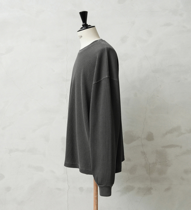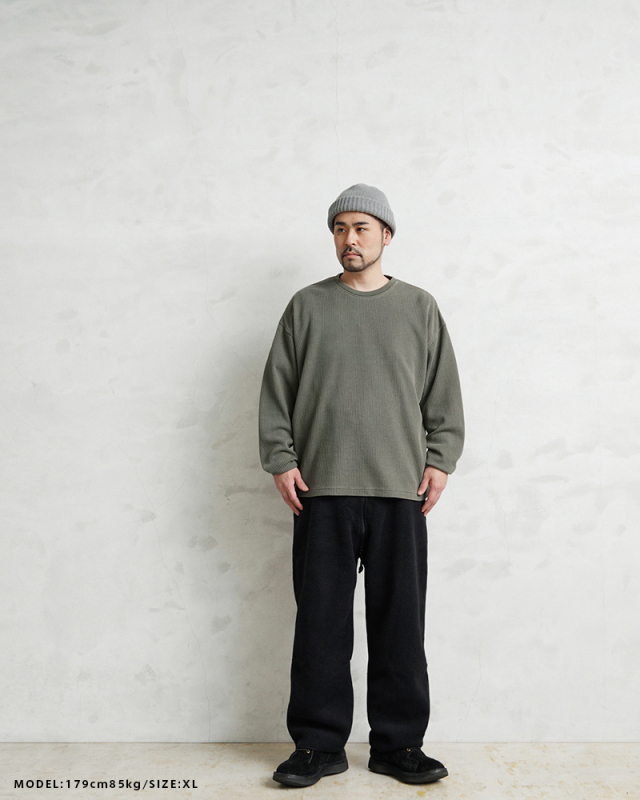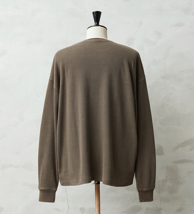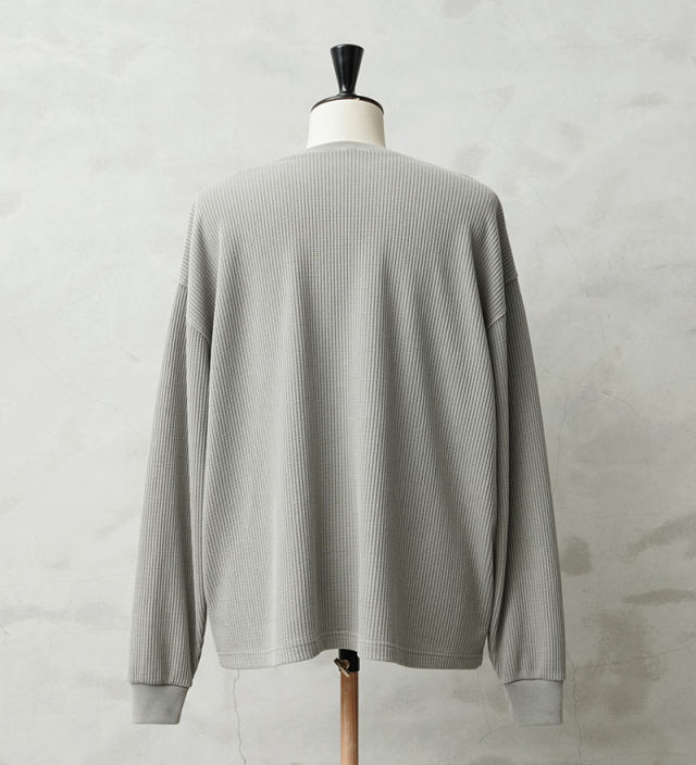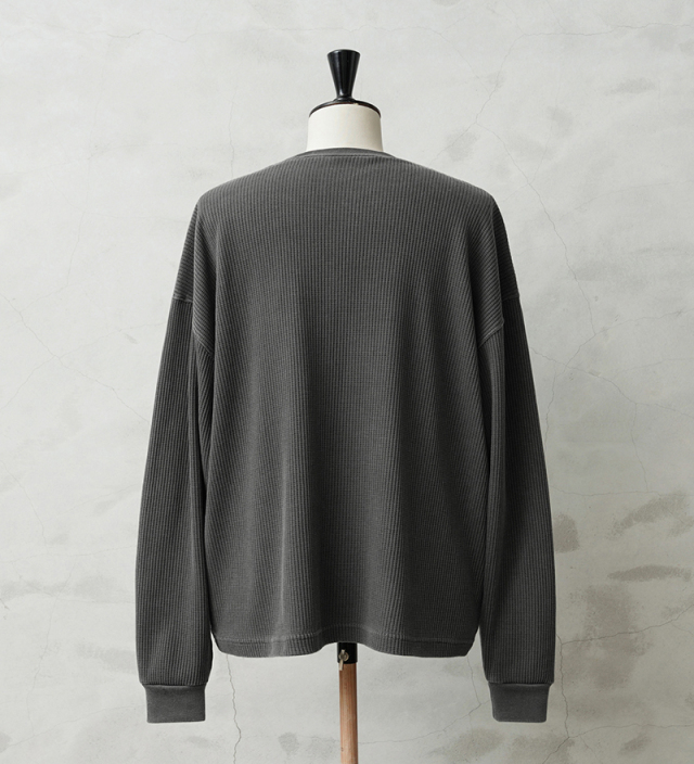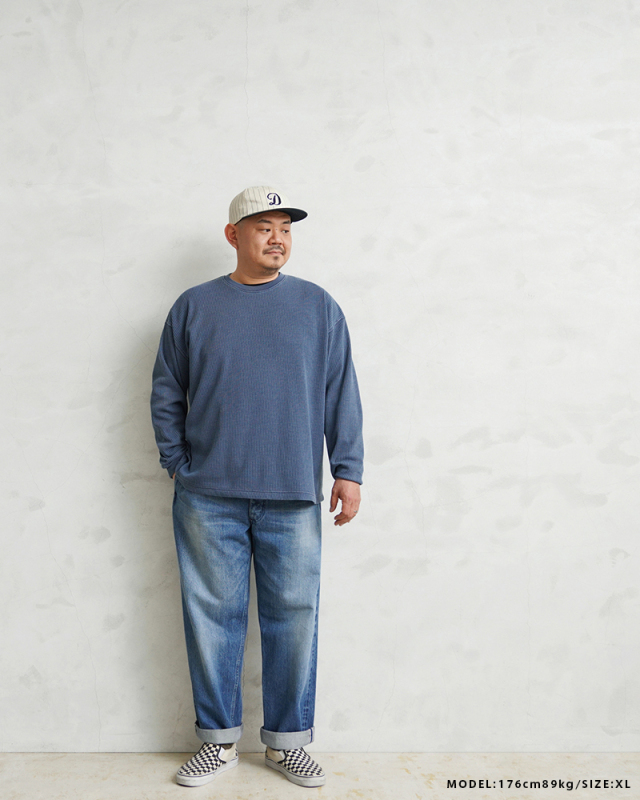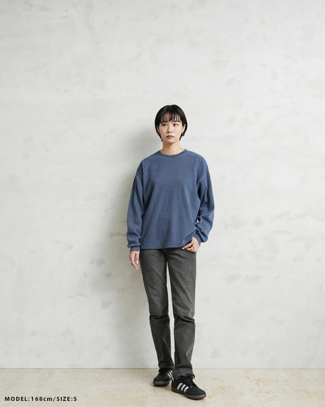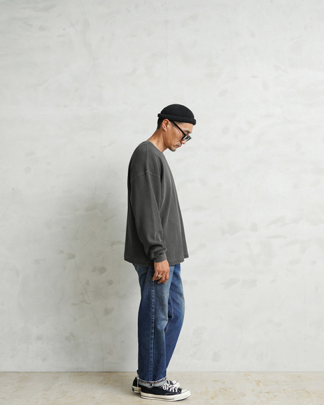 | 商品説明 | SCREEN STARS×WAIPER L/S クルーネック サーマル Tシャツ PIGMENT のご紹介です。 品名:L/S thermal T-shirt 品番:2523-455WP ヴィンテージTシャツのボディとしてもファンの多いSCREEN STARSとWAIPERのコラボTシャツが完成しました。 今回はミリタリーアイテムとも相性のいいサーマルTシャツを製作。 ミリタリーのサーマルと言えばハニカムというイメージですが、今回はあえて様々なアイテムと合わせやすいようワッフル生地を採用。ワッフルのゲージも一般的なものよりもわずかに目を粗くすることでより立体的でカジュアルな印象に。 生地は9ozと程よい厚みがあり、素材にコットン×ポリエステルの混紡素材を使用することにより洗濯時もシワになりにくく、サイズブレなどもあまりないためお手入れが簡単です。 身幅・アームホールにゆとりを持たせた絶妙なボックスシルエットは、着用時のストレスがなく見た目の印象も程よくルーズで、カーゴパンツ・デニム・スラックスなどあらゆるボトムスに合わせやすい1枚となっております。 襟元のタグは80年代に使用されていたペーパータグを使用し、ブランドネーム横のラインはWAIPERだけのオリーブカラーで限定感を演出しております。 そんなこだわりのサーマルにピグメント染め(顔料染め)を施すことで長年着込んだような風合いがプラスされるほか、生地自体も米綿かの様なシャリ感が生まれ、雰囲気抜群の一枚に仕上がりました。 |