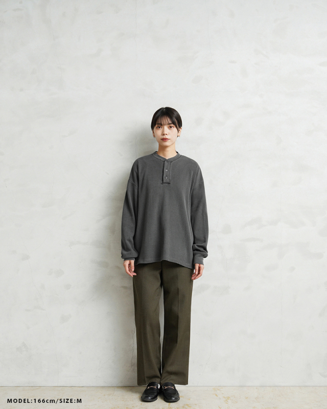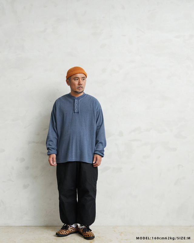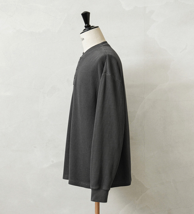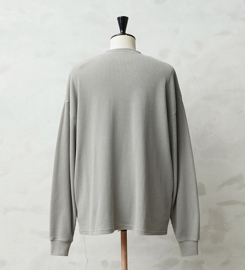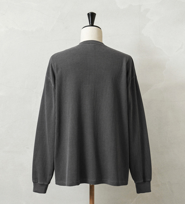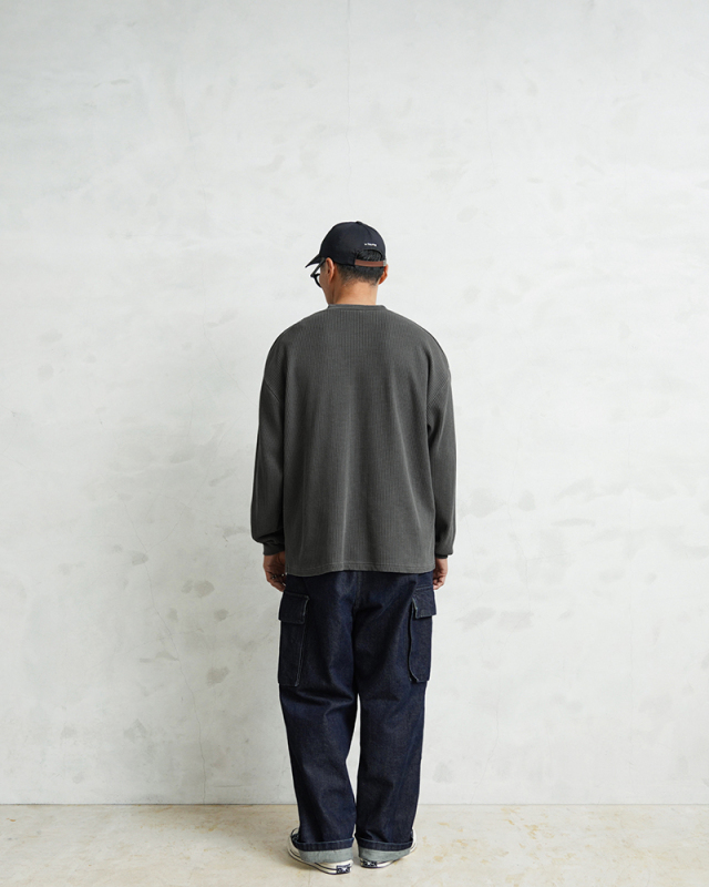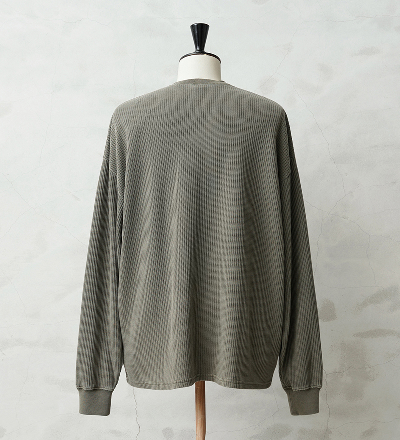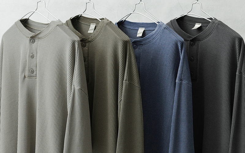 生地は9ozと程よい厚みがあり、素材にコットン×ポリエステルの混紡素材を使用することにより洗濯時もシワになりにくく、サイズブレなどもあまりないためお手入れが簡単です。 首元はクラシカルな印象を与えるヘンリーネック、ボタンは糸が擦り切れにくくなっている猫目ボタンを採用しています。襟元のタグは80年代に使用されていたペーパータグを使用し、ブランドネーム横のラインはWAIPERだけのオリーブカラーで限定感を演出しております。 そんなこだわりのサーマルにピグメント染め(顔料染め)を施すことで長年着込んだような風合いがプラスされるほか、生地自体も米綿かの様なシャリ感が生まれ、雰囲気抜群の一枚に仕上がりました。