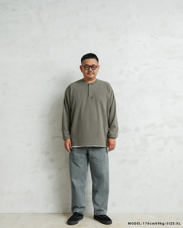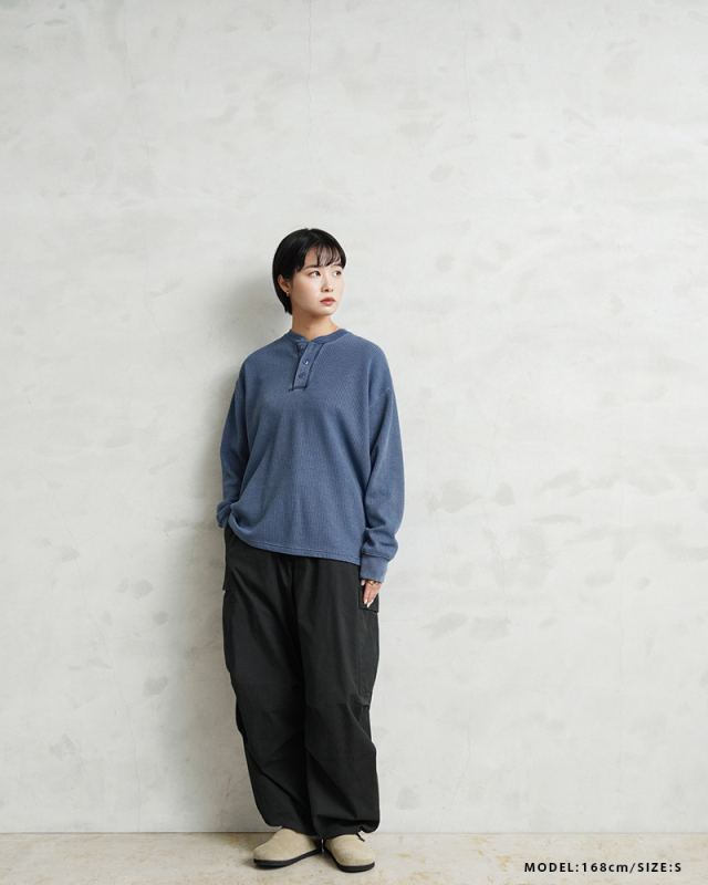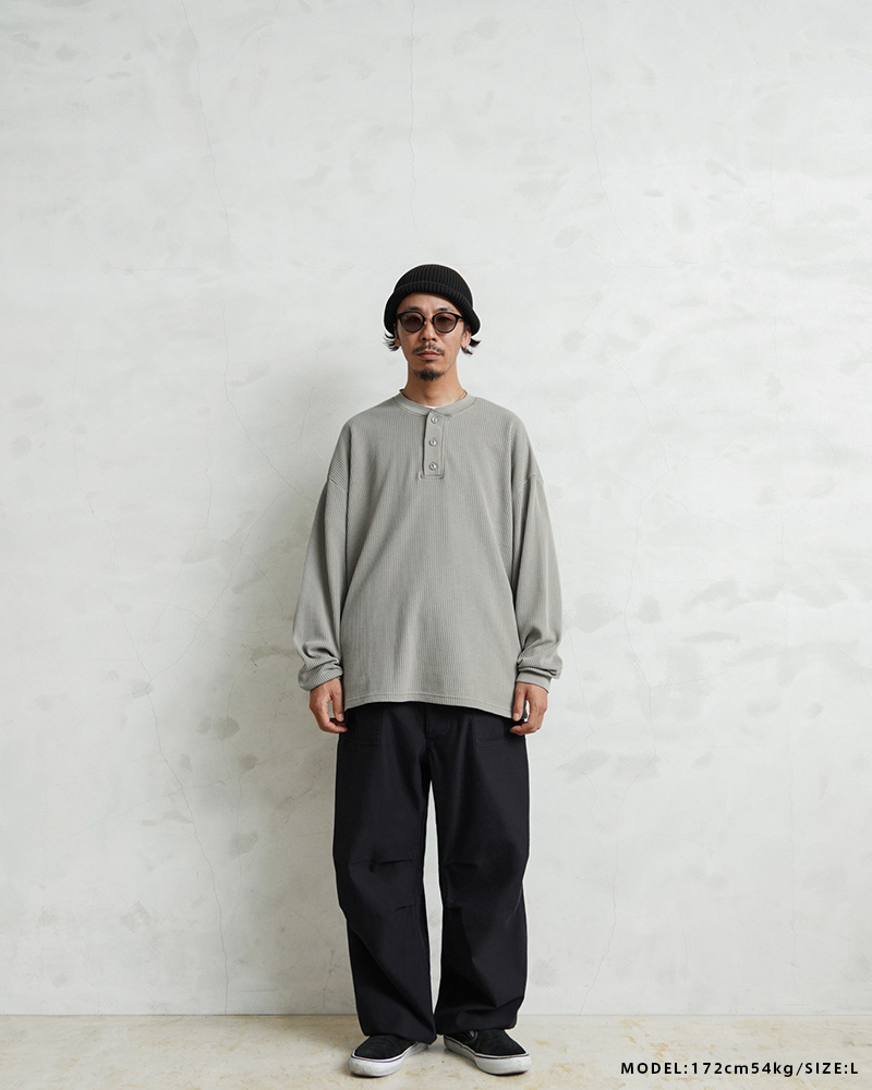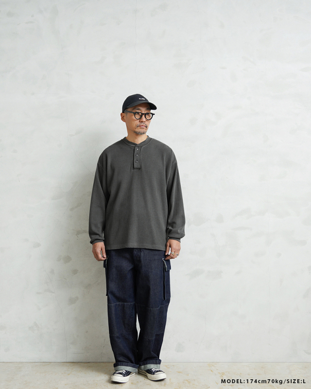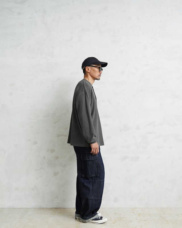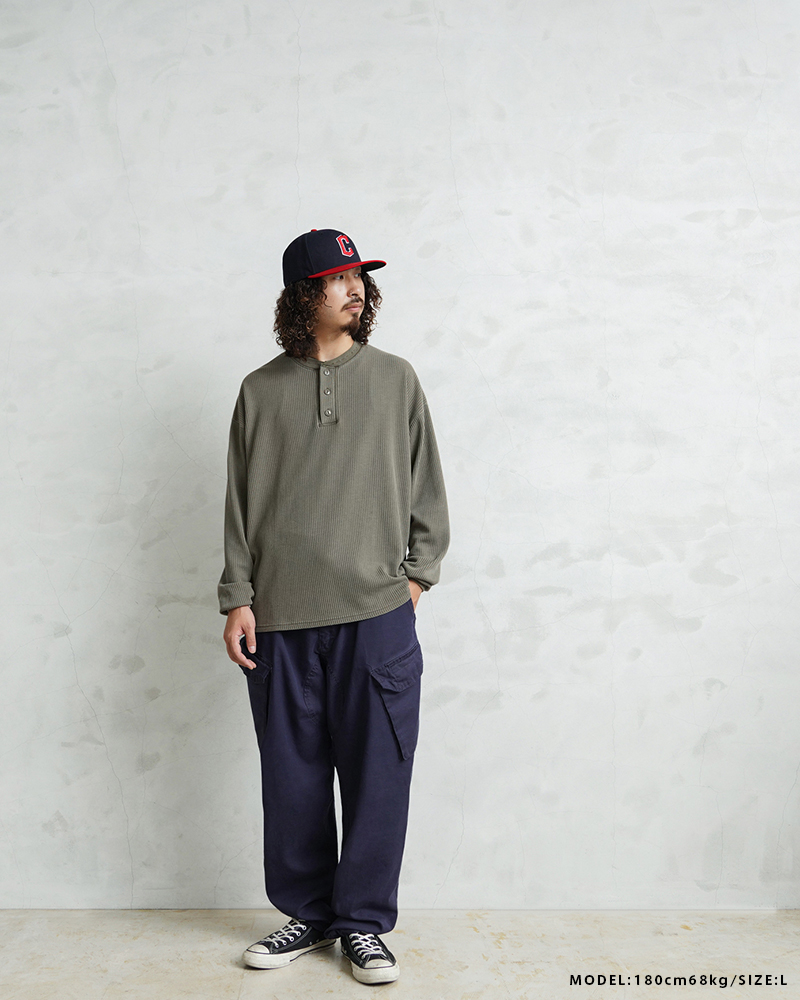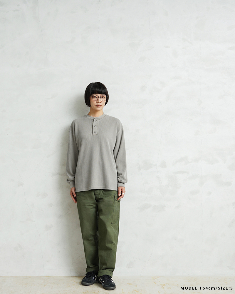 | 商品説明 | SCREEN STARS×WAIPER L/S ヘンリーネック サーマル Tシャツ PIGMENT のご紹介です。 品名:L/S thermal T-shirt 品番:2523-456WP ヴィンテージTシャツのボディとしてもファンの多いSCREEN STARSとWAIPERのコラボTシャツが完成しました。 今回はミリタリーアイテムとも相性のいいサーマルTシャツを製作。 ミリタリーのサーマルと言えばハニカムというイメージですが、今回はあえて様々なアイテムと合わせやすいようワッフル生地を採用。ワッフルのゲージも一般的なものよりもわずかに目を粗くすることでより立体的でカジュアルな印象に。 生地は9ozと程よい厚みがあり、素材にコットン×ポリエステルの混紡素材を使用することにより洗濯時もシワになりにくく、サイズブレなどもあまりないためお手入れが簡単です。 身幅・アームホールにゆとりを持たせた絶妙なボックスシルエットは、着用時のストレスがなく見た目の印象も程よくルーズで、カーゴパンツ・デニム・スラックスなどあらゆるボトムスに合わせやすい1枚となっております。 首元はクラシカルな印象を与えるヘンリーネック、ボタンは糸が擦り切れにくくなっている猫目ボタンを採用しています。襟元のタグは80年代に使用されていたペーパータグを使用し、ブランドネーム横のラインはWAIPERだけのオリーブカラーで限定感を演出しております。 そんなこだわりのサーマルにピグメント染め(顔料染め)を施すことで長年着込んだような風合いがプラスされるほか、生地自体も米綿かの様なシャリ感が生まれ、雰囲気抜群の一枚に仕上がりました。 |
