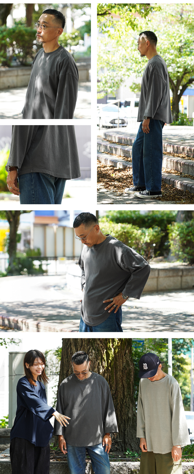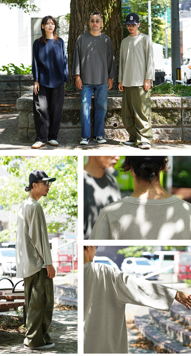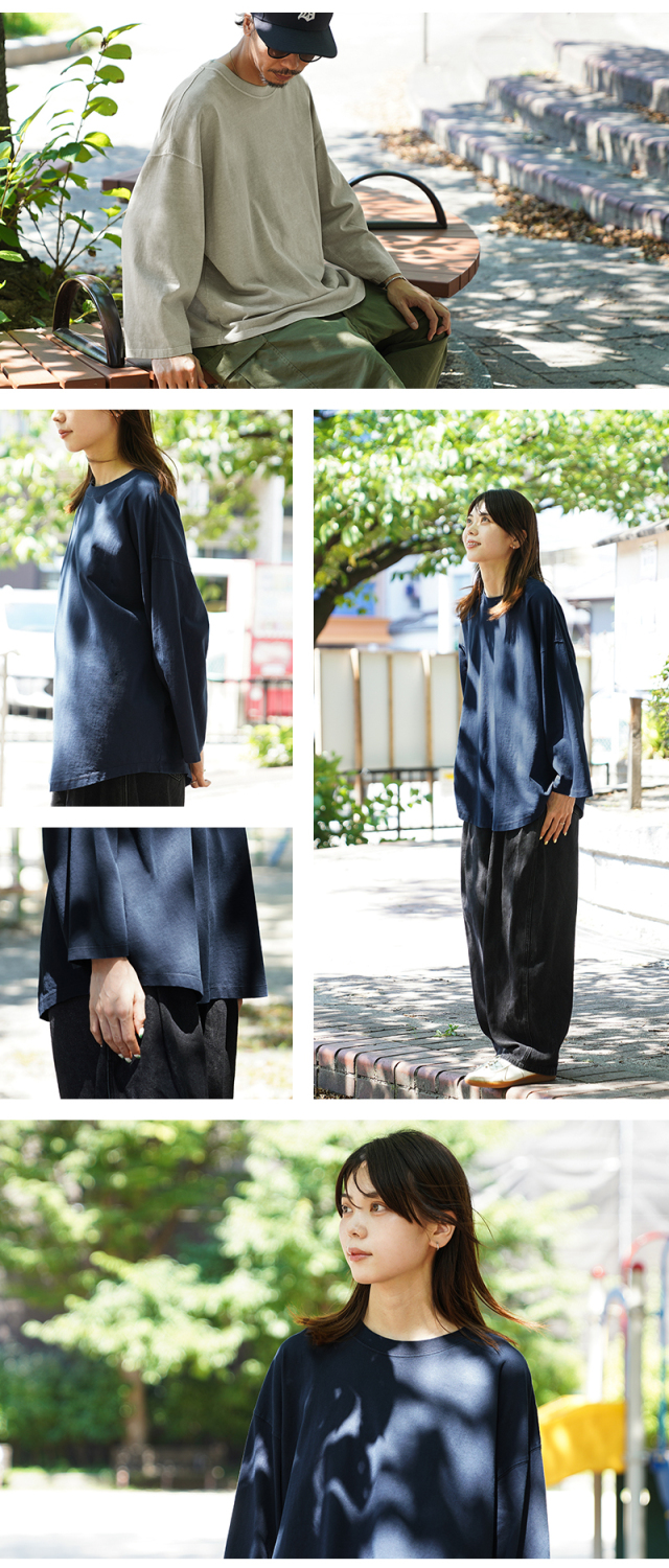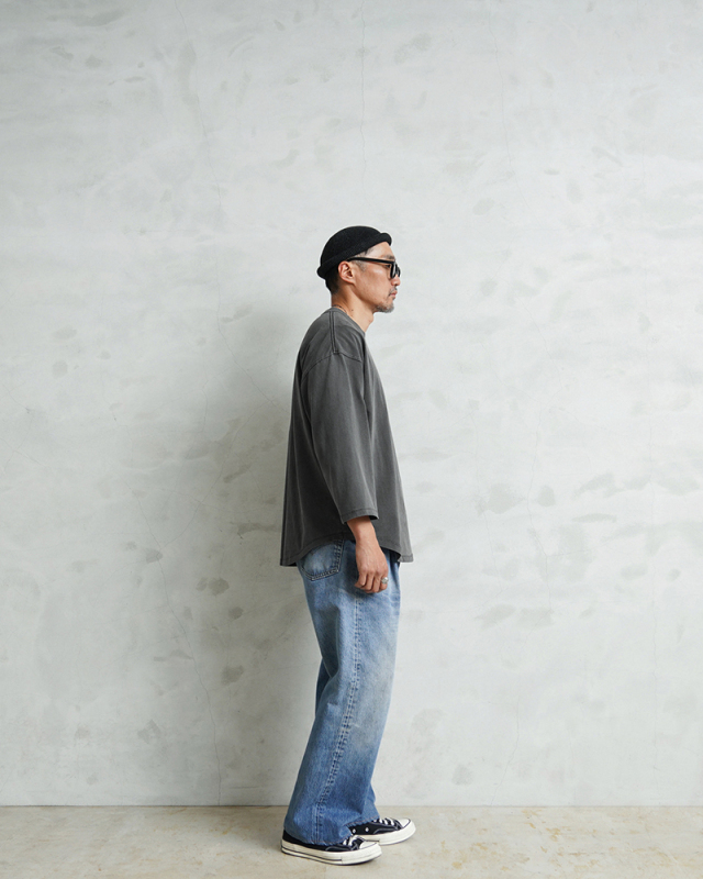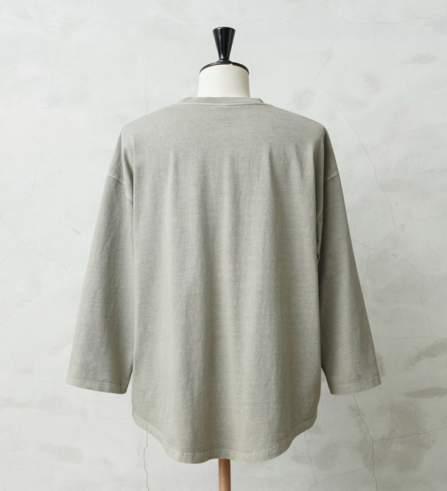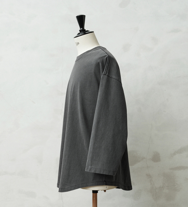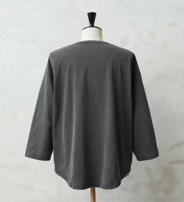 今回は定番ラインで使用している生地ではなく、よりピグメント染めの表情が出るようドライ感のある8.5ozの程よく肉厚な生地に変更。洗濯を繰り返すことで表情の変化もお楽しみいただけます。 比較的ゆったりとしたシルエットですが、絶妙なパターンによりドレープ感もあるためカジュアルなアイテムながらもエレガントな印象すら与えます。 「裾のラウンド仕様」は、男女問わずジェンダーレスに着こなすことのできる、デザインポイントです。 九分袖~八分袖の、絶妙な袖丈が、軽快感と洒落感を演出し、時計や腕周りのアクセサリーも映えます。 一見シンプルなカットソーながらも、長袖でも半袖でも七分袖でもないオンリーワンのデザインは日頃のコーディネイトにちょうどいいスパイスを効かせるアイテムです。 この別注アイテムでは定番ラインでは展開していないSサイズもご準備しておりますので、より多くの方へ手に取ってご体感いただきたいです。