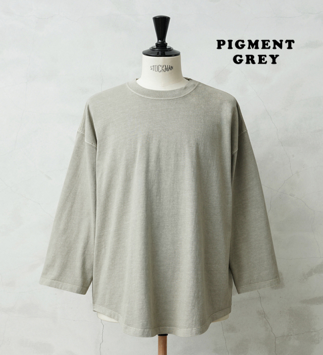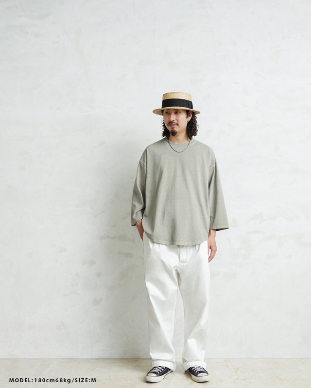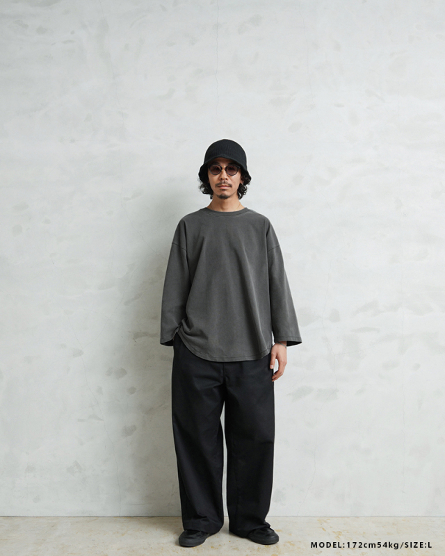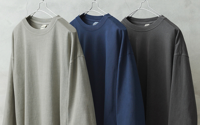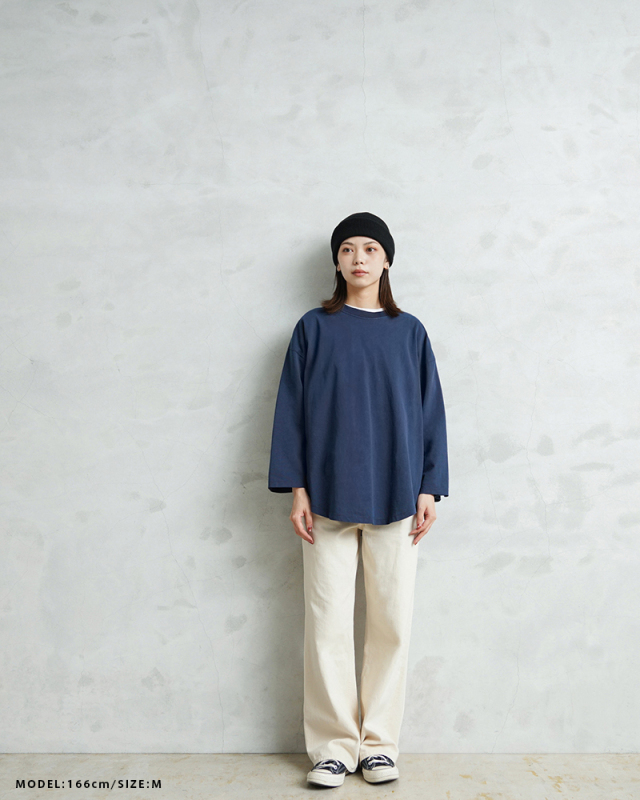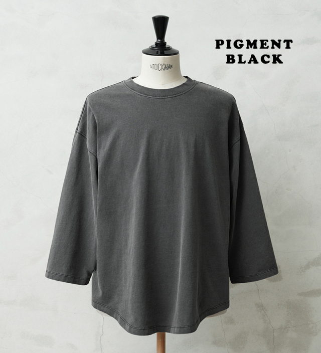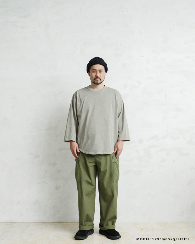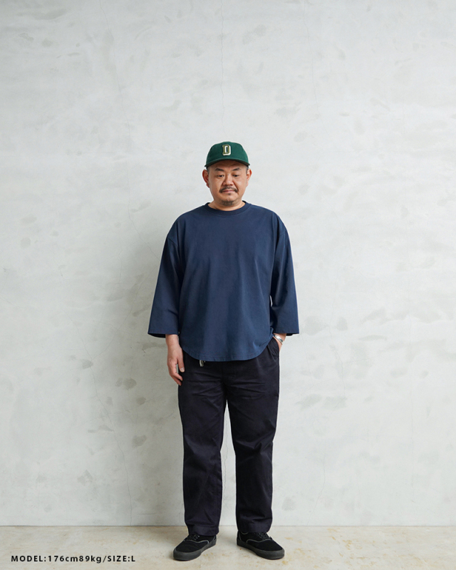 今回は定番ラインで使用している生地ではなく、よりピグメント染めの表情が出るようドライ感のある8.5ozの程よく肉厚な生地に変更。洗濯を繰り返すことで表情の変化もお楽しみいただけます。 比較的ゆったりとしたシルエットですが、絶妙なパターンによりドレープ感もあるためカジュアルなアイテムながらもエレガントな印象すら与えます。 「裾のラウンド仕様」は、男女問わずジェンダーレスに着こなすことのできる、デザインポイントです。 九分袖~八分袖の、絶妙な袖丈が、軽快感と洒落感を演出し、時計や腕周りのアクセサリーも映えます。 一見シンプルなカットソーながらも、長袖でも半袖でも七分袖でもないオンリーワンのデザインは日頃のコーディネイトにちょうどいいスパイスを効かせるアイテムです。 この別注アイテムでは定番ラインでは展開していないSサイズもご準備しておりますので、より多くの方へ手に取ってご体感いただきたいです。