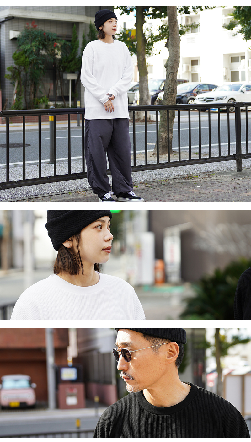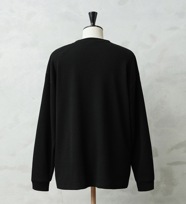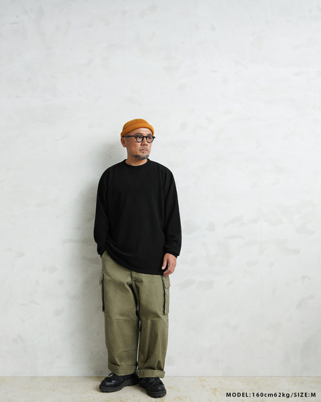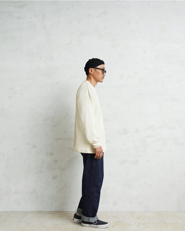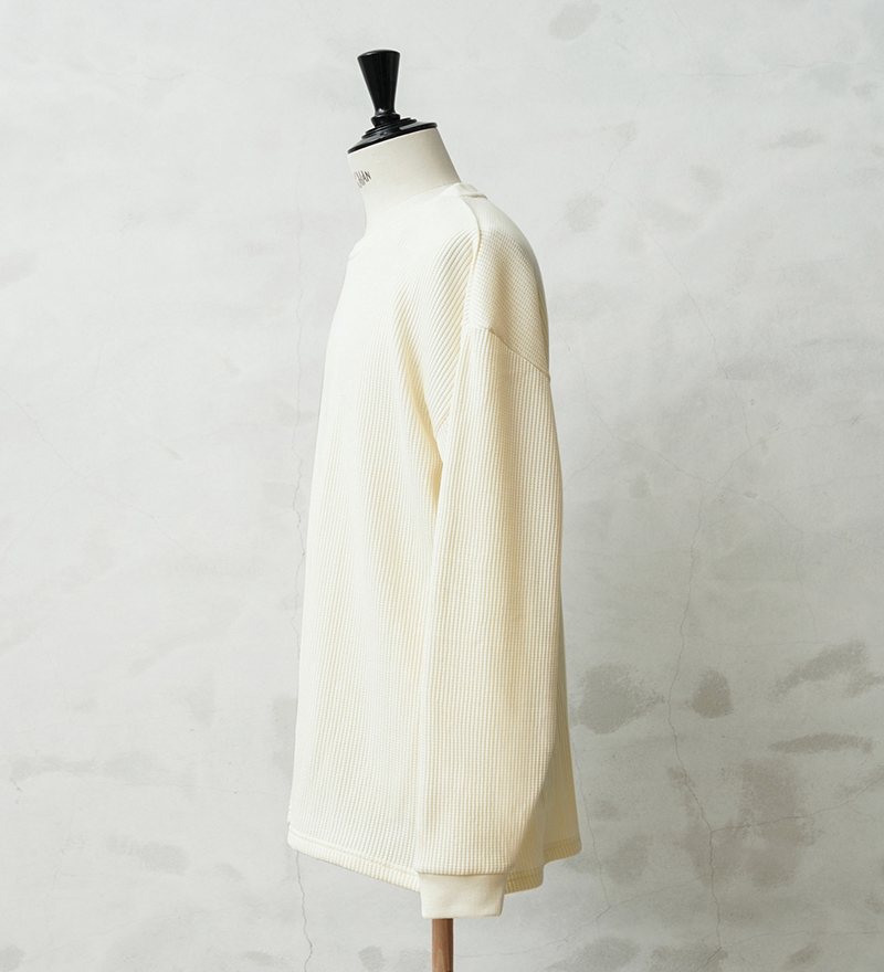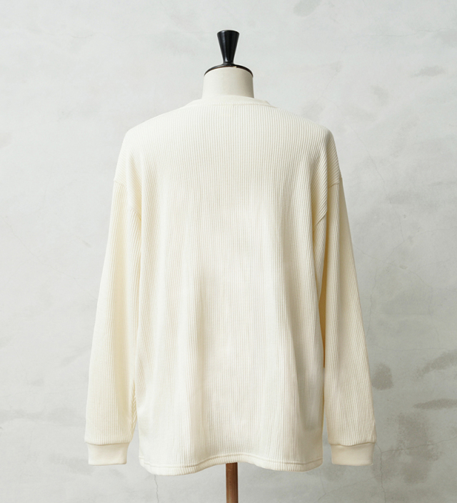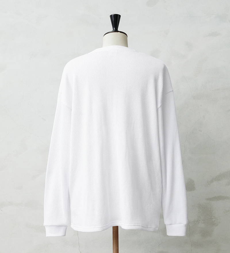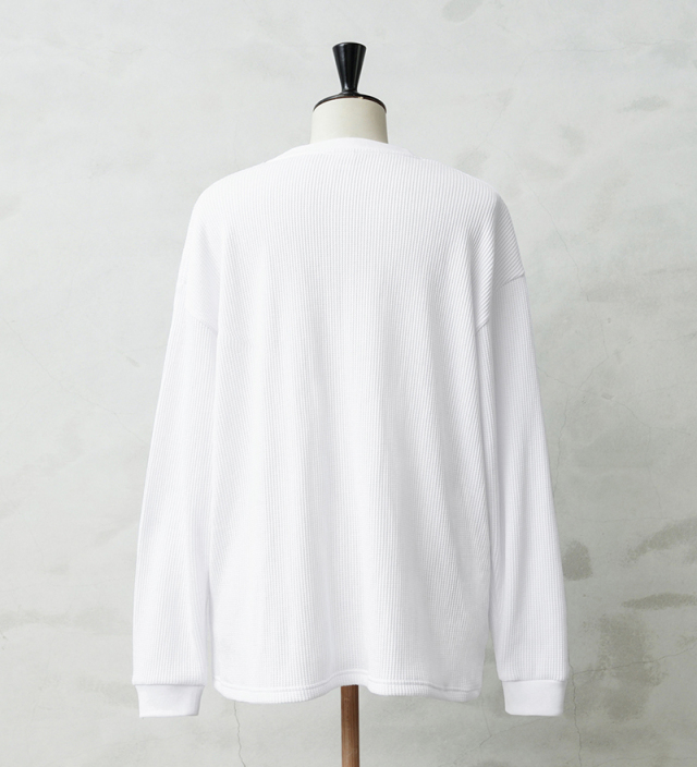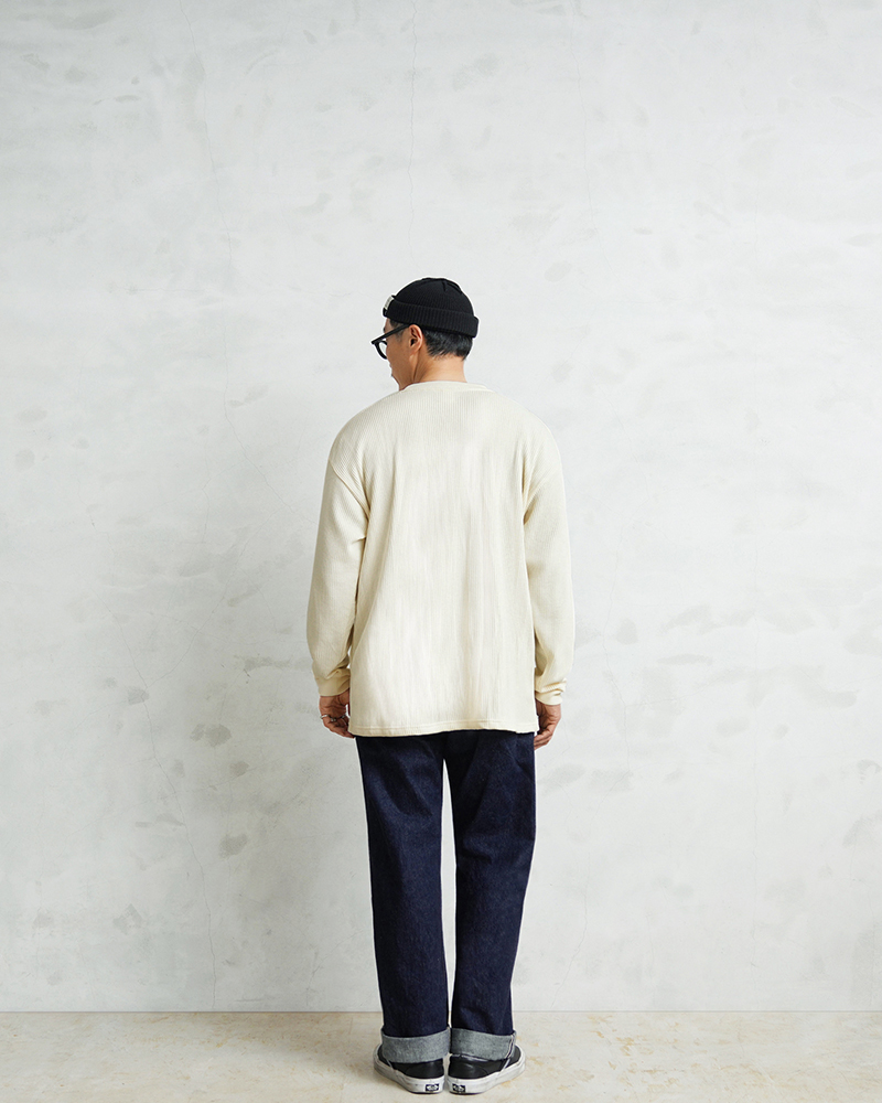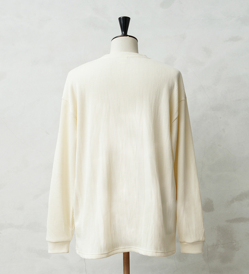 定評のある9ozの立体的なT/C素材のワッフル生地はそのままに、シルエットをリニューアル。 前作のルーズなボックスシルエットに対し、今回は身幅とアームホールを程よく絞ることで、ジャケットやシャツのインナーとして着用しても着膨れしない絶妙なフィット感を実現。さらに着丈を若干長く設定することで、タックインスタイルや、トップスの裾からワッフル地を覗かせるレイヤードスタイルにも最適なバランスに仕上げています。 今回のシルエットは、太めのカーゴパンツやM-51パンツと合わせても野暮ったくならず、全体をクリーンな印象に引き締めます。ミリタリー特有の無骨さと、計算されたシャープなラインが同居する、まさに「大人のためのサーマル」です。 襟元のタグは80年代に使用されていたペーパータグを使用し、ブランドネーム横のラインはWAIPERだけのオリーブカラーで限定感を演出しております。