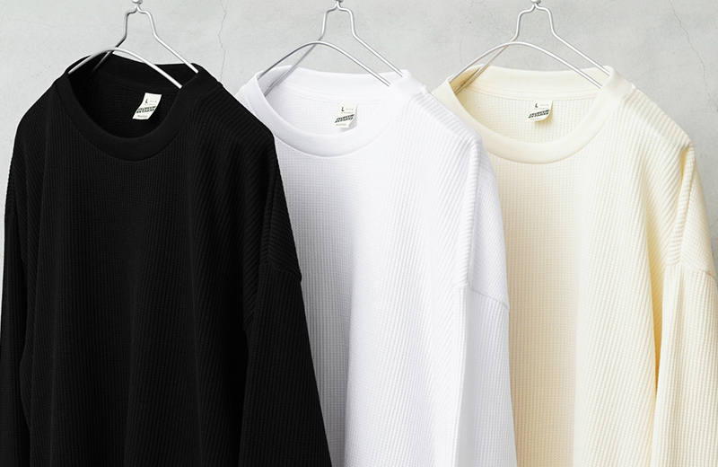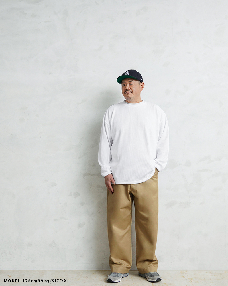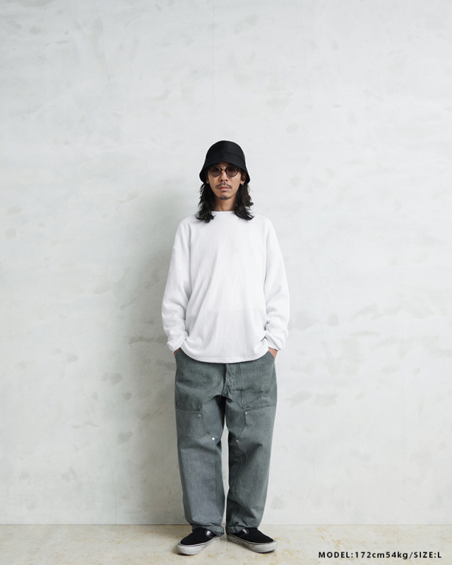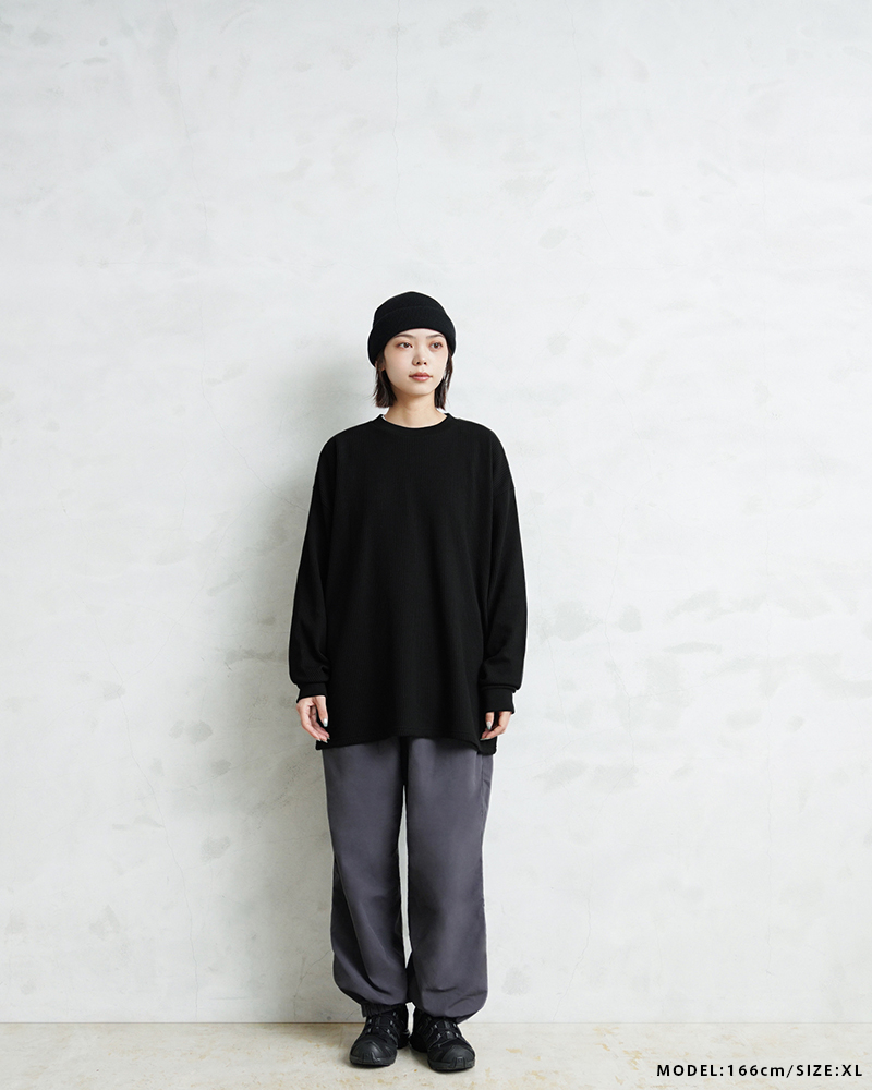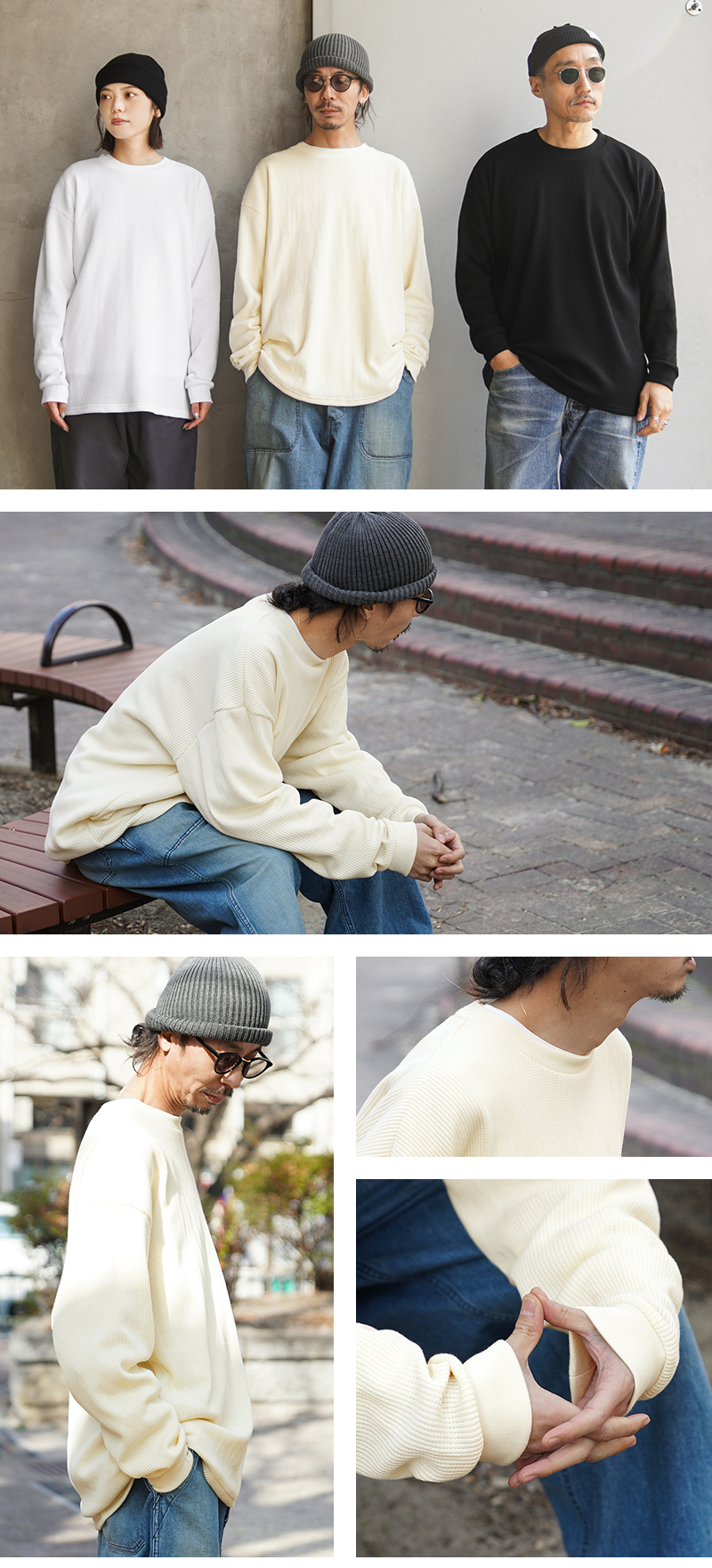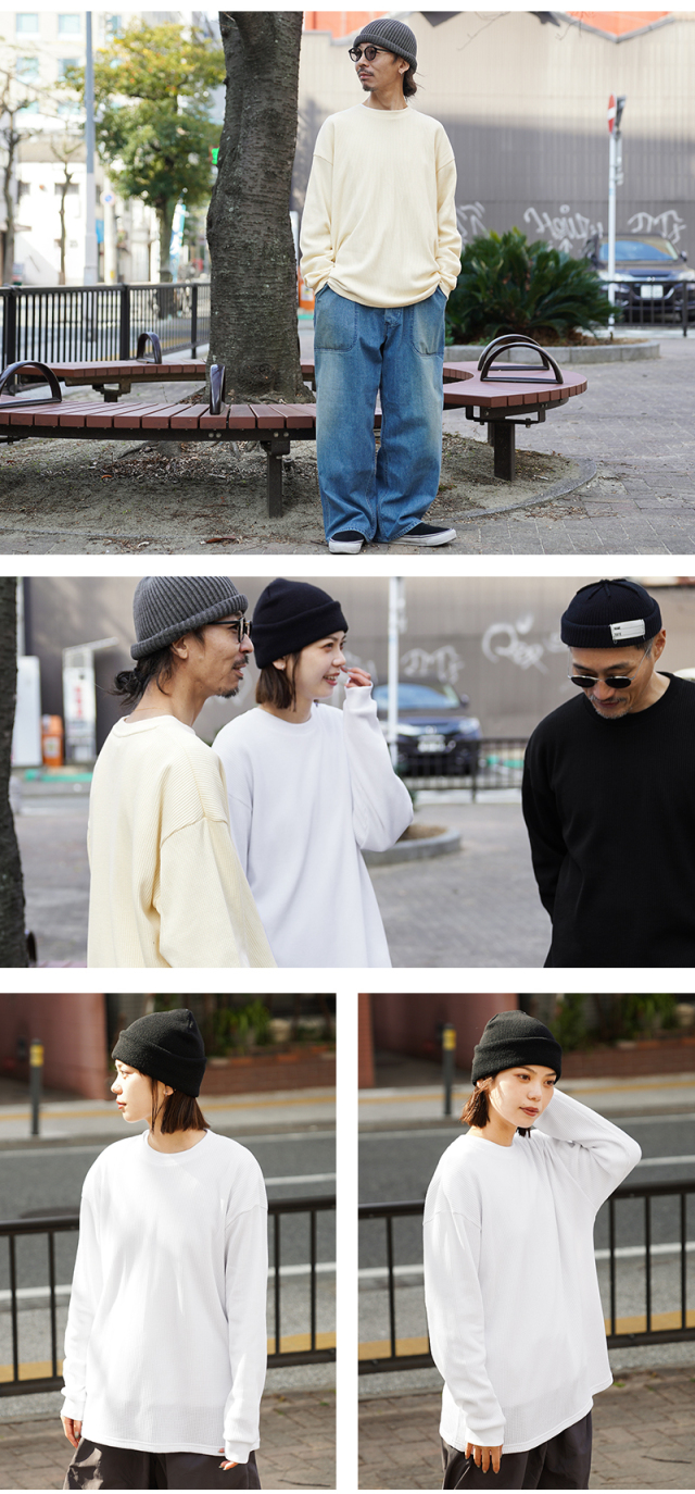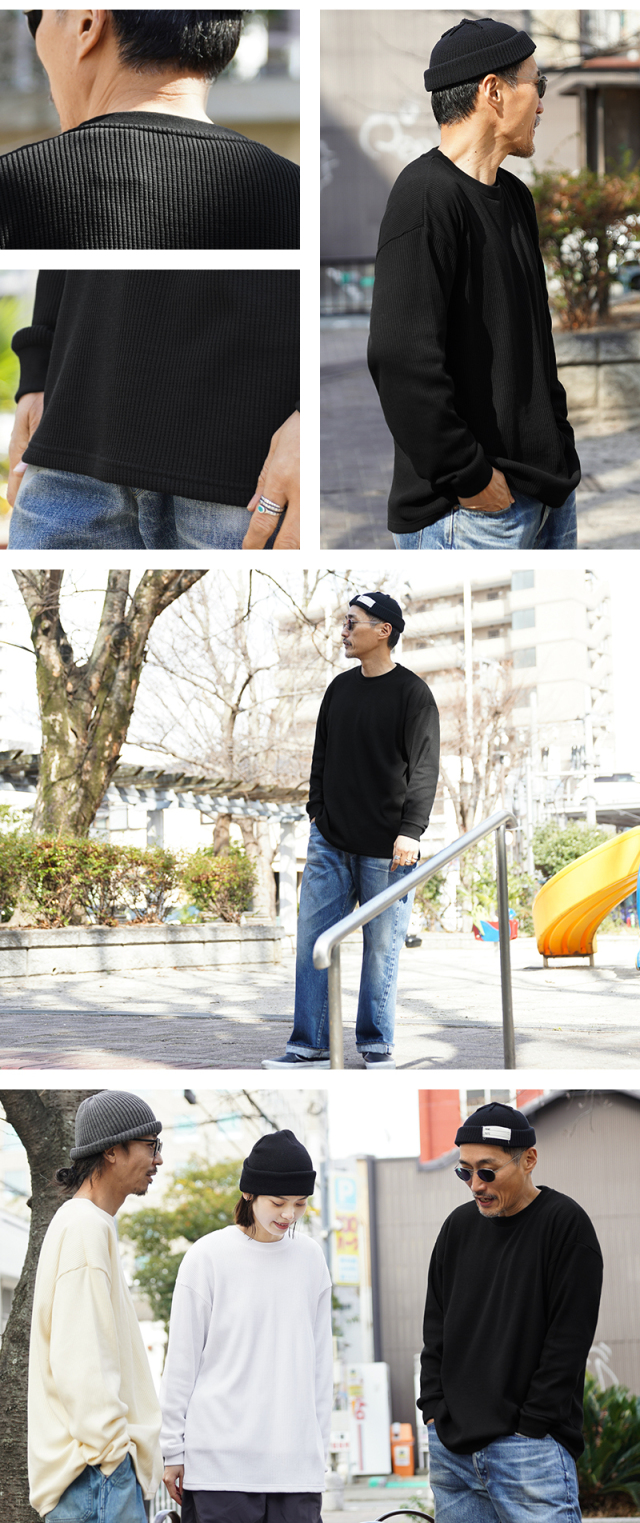 定評のある9ozの立体的なT/C素材のワッフル生地はそのままに、シルエットをリニューアル。 前作のルーズなボックスシルエットに対し、今回は身幅とアームホールを程よく絞ることで、ジャケットやシャツのインナーとして着用しても着膨れしない絶妙なフィット感を実現。さらに着丈を若干長く設定することで、タックインスタイルや、トップスの裾からワッフル地を覗かせるレイヤードスタイルにも最適なバランスに仕上げています。 今回のシルエットは、太めのカーゴパンツやM-51パンツと合わせても野暮ったくならず、全体をクリーンな印象に引き締めます。ミリタリー特有の無骨さと、計算されたシャープなラインが同居する、まさに「大人のためのサーマル」です。 襟元のタグは80年代に使用されていたペーパータグを使用し、ブランドネーム横のラインはWAIPERだけのオリーブカラーで限定感を演出しております。
