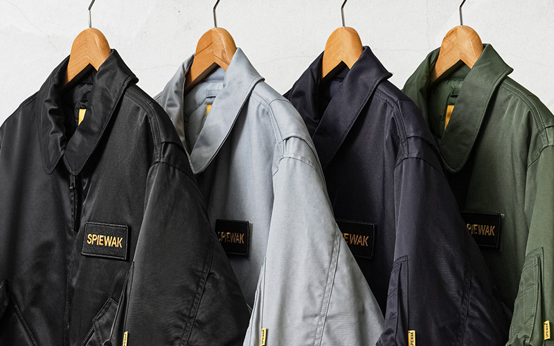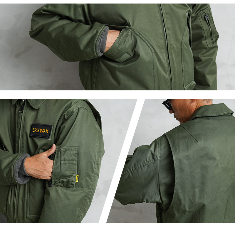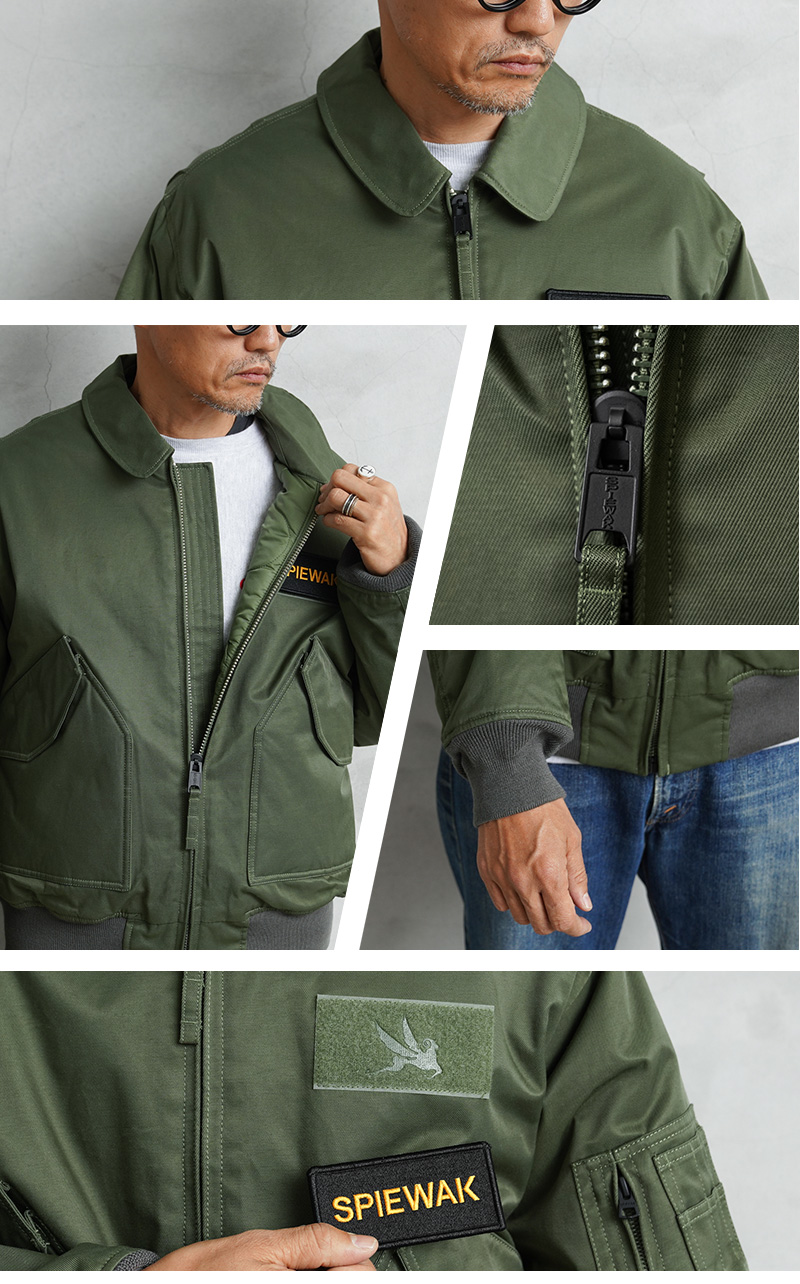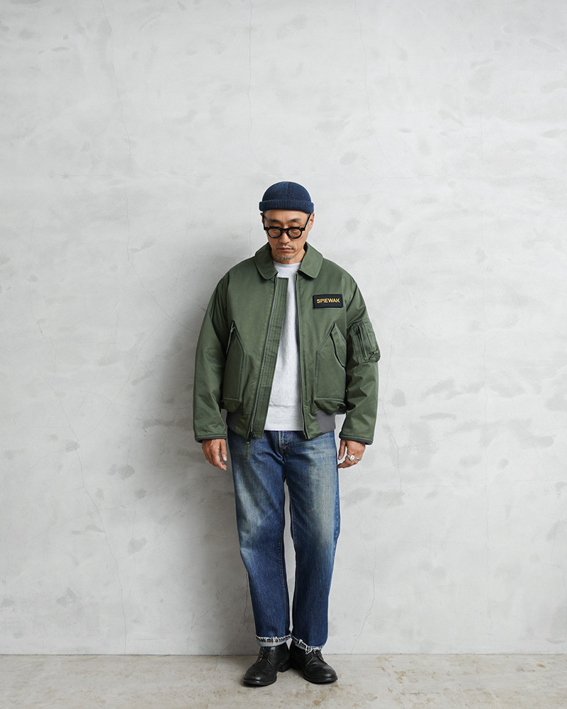 確かな技術を持つSPIEWAKが、1973年初期のA型モデル、CWU-45Pをベースに民生用として展開していた55Pモデルを復刻しました。現代ミリタリーに影響を与えたCWUシリーズ。程よくゆとりのあるボリューム、腰丈のコンパクトなプロポーション、フライトジャケットらしい丸みと安心感のあるシルエットが特徴です。物が出し入れしやすい斜め配置の大型フラップポケット、ペンホルダーを備えた多機能ポケット、ジッパーを隠す比翼仕様のフロント、ミリタリーウェアの実用性を感じさせる象徴的なディテール。タフで武骨さを感じさせながらも、都会的なスタイリングにもマッチするデザインになっています。