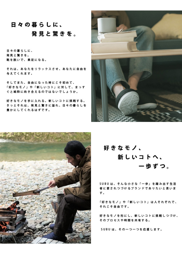 冬の新しい足元をデザインするSUBUと、機能性や品質をこだわり抜くNANGAがコラボしたサンダルが登場しました。 サンダルは夏のもの、そんなイメージを一掃する今までにない冬用サンダル。 今回はアッパー部分にNANGA独自の多孔質ポリウレタン防水コーティング素材「AURORA-TEX」を採用。AURORA-TEXは防水性を高めさらに蒸気透湿性を高める性質をもつので、外出時の雨や汚れを防ぎつつムレを放出してくれることによって快適さを保ちます。 またクッション性の高い厚みのある4層構造のインソール部分には、アブストラクトカモ柄をプリントとした起毛加工で内側の保温性・デザイン性にもこだわりました。ライニングとともに足全体にフィットする快適な履き心地にくわえ、厚みがあることによって地面からの冷気も防いでくれます。 ディテールはSUBUそのままのキルティングデザインに、中央に配置したNANGAのロゴがアクセントになった一足です。 付属の収納袋も従来のSUBUのものとは全く異なり、2つのブランドロゴが真ん中に大きく配置されたメッシュ素材のスポーティーなデザインとなっております。 SUBUとNANGAがデザイン・機能性・履き心地すべてにこだわり抜いたアイテムは、デイリーユースだけでなくアウトドアで大活躍すること間違いなし。一度履くと手放せなくなるくらい優しい履き心地は、冬のマストアイテムになるのではないでしょうか。自分用にはもちろん、男女問わずプレゼントにも喜ばれる一足です。 |