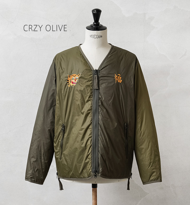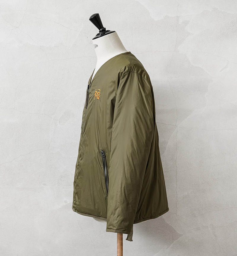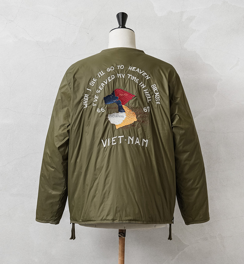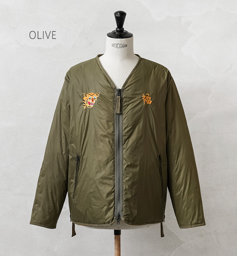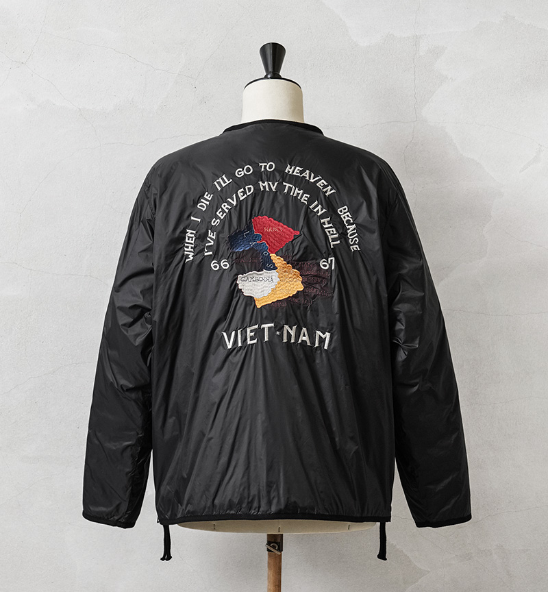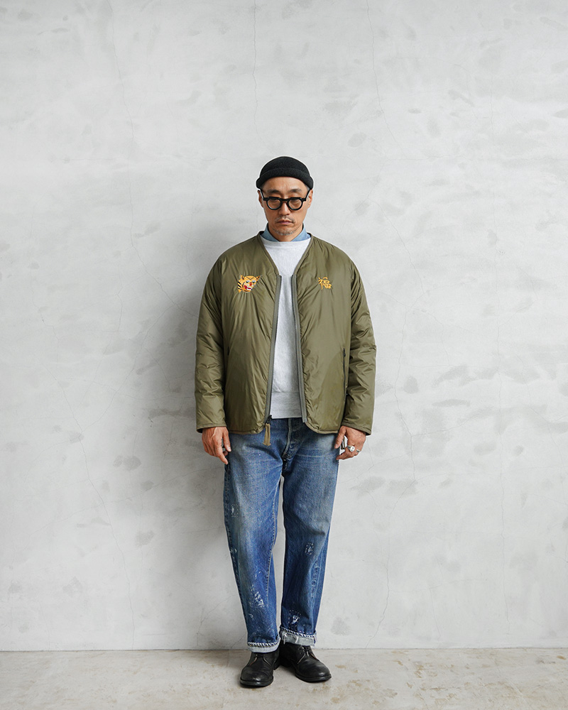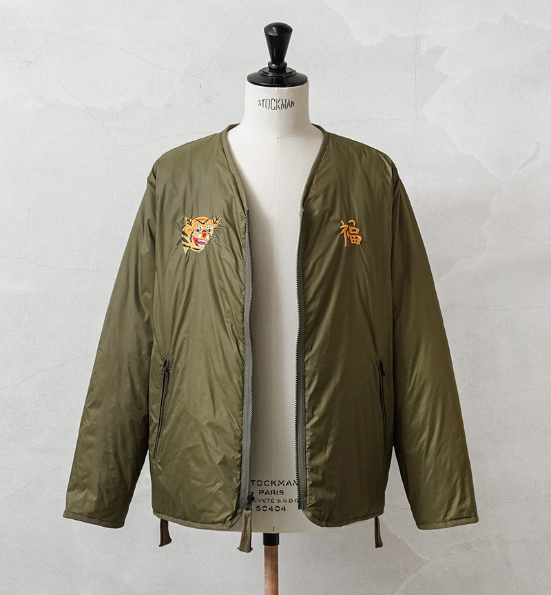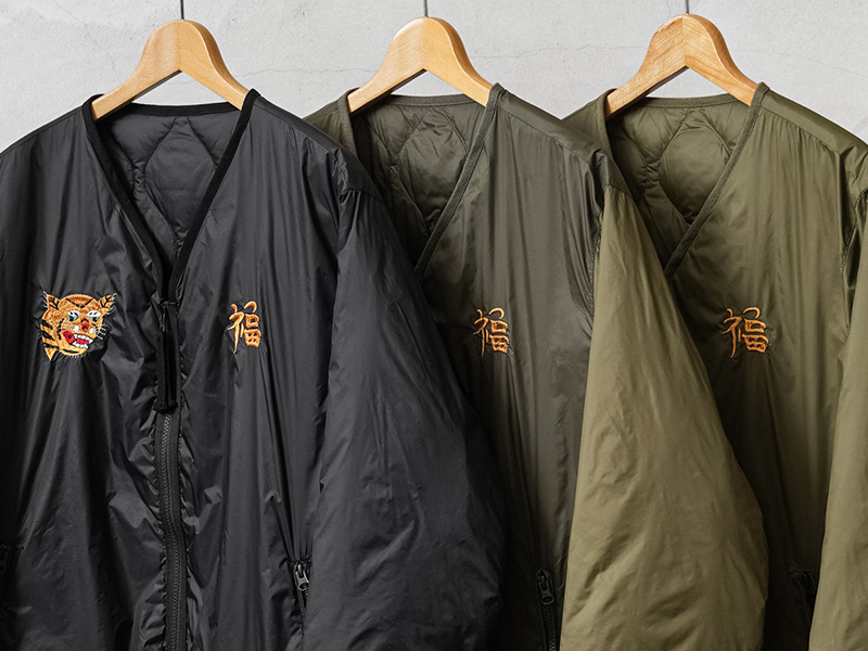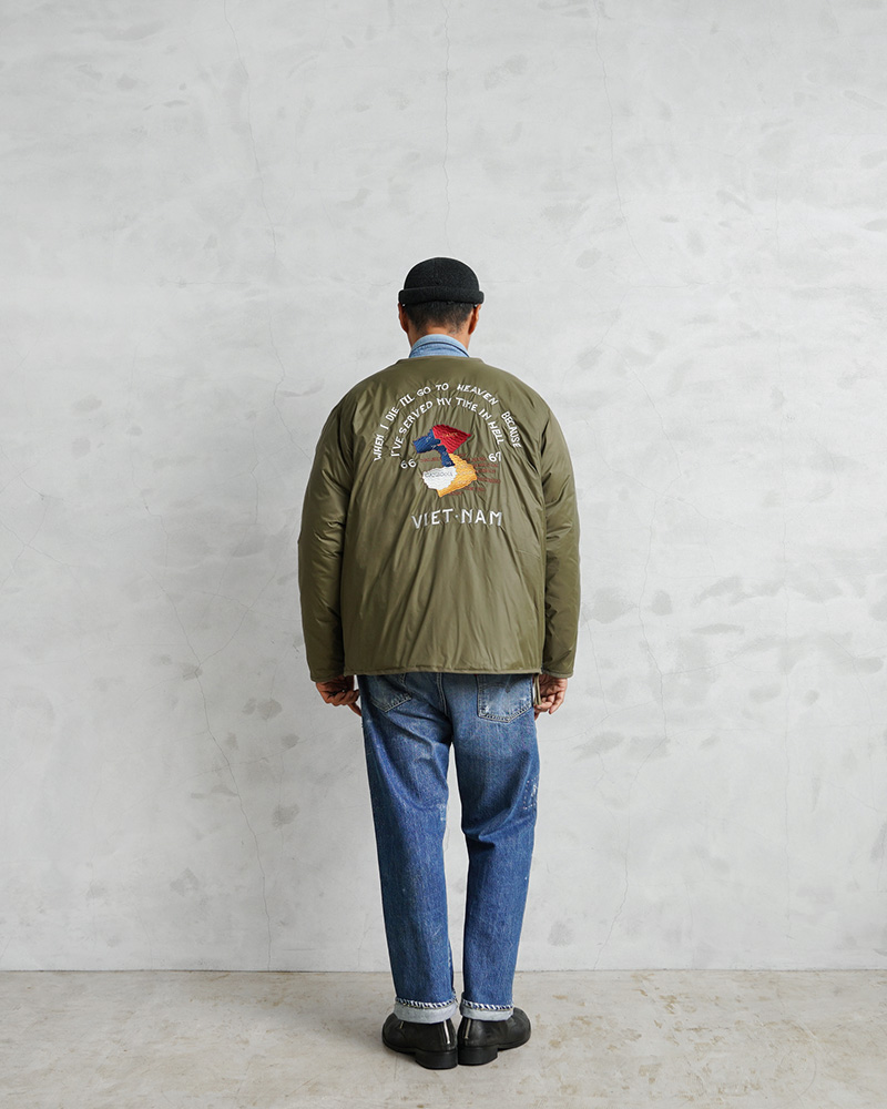 TAIONから、ヴィンテージ感や刺繍を活かした、ベトジャン風リバーシブルダウンジャケットが登場。JAPAN SPECIAL(JPNSP)は、様々なデザイナーと創り上げる、 TAIONの中でもデザイン性が高く、独自性のあるアイテムを展開するラインです。軽くて弾力のある800フィルパワーのダウンを使用。一般で使用されるダウンよりも軽くて、 暖かい空気をたくさん含むことができます。フロントはダブルジッパー開閉、少しゆとりをもたせたシルエットで、すっきりしたVネックは、シャツやパーカーとの重ね着やマフラーとの相性も抜群。リラックス感と動きやすさを兼ね備え、アウターとしてもインナーダウンとしてももたつかず重宝します。表側は印象的なベトジャン刺繍を拝したデザイン、裏側はヘチマキルトを配したダウンジャケット、気分やコーデに合わせて楽しめるリバーシブル仕様。