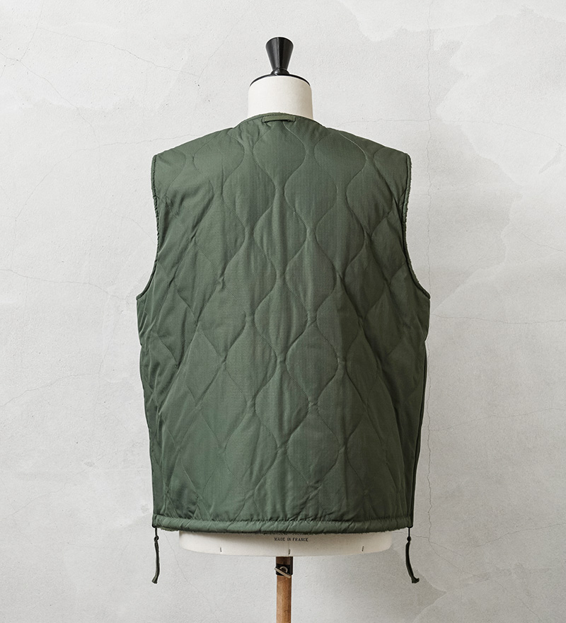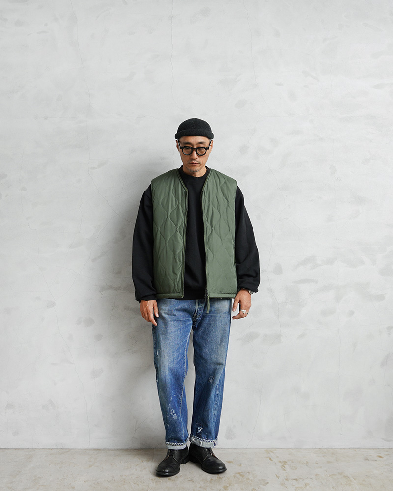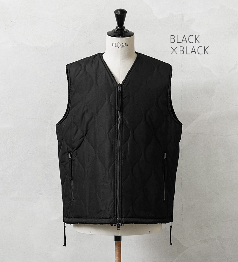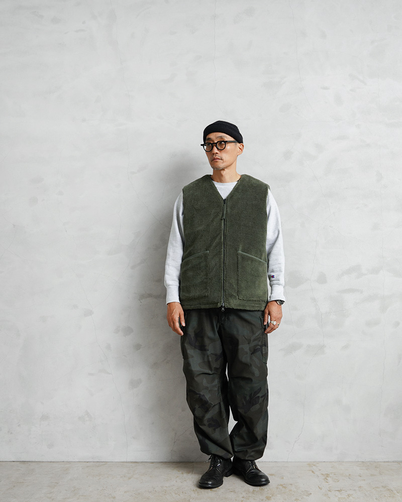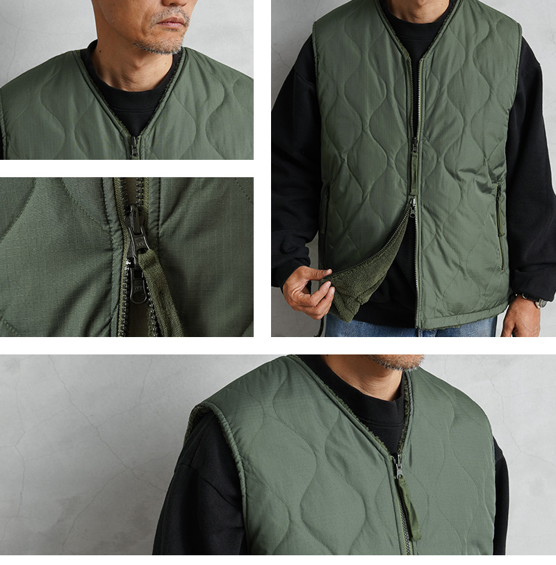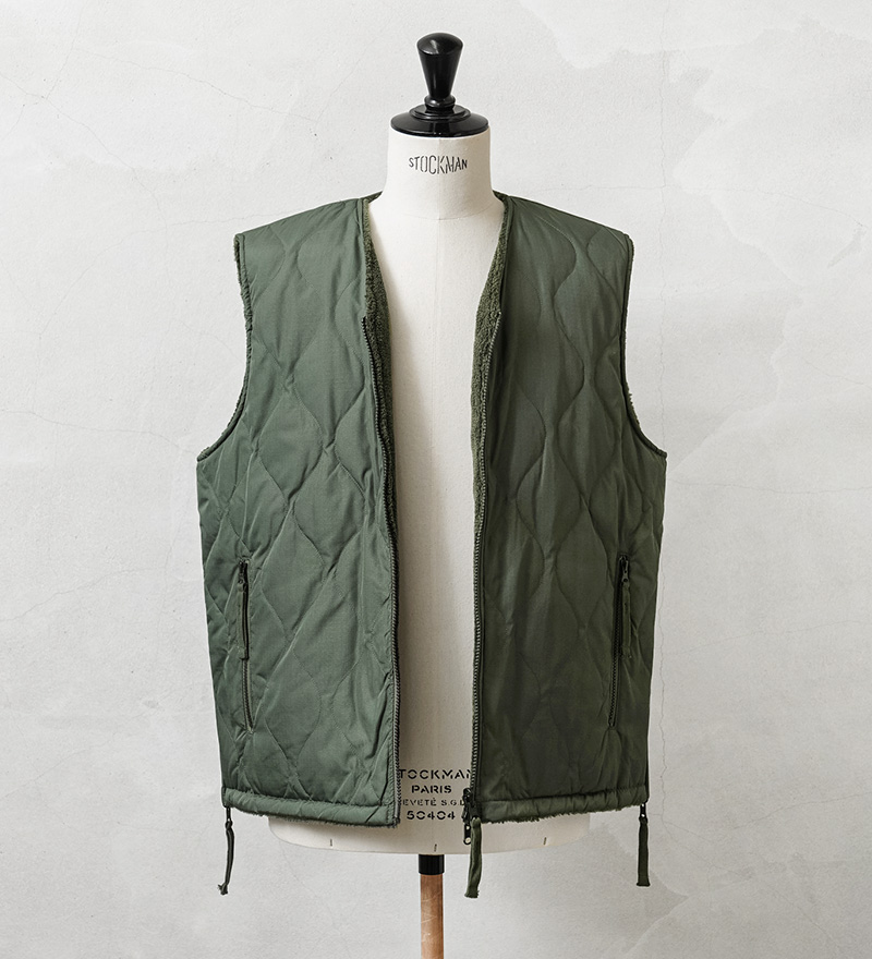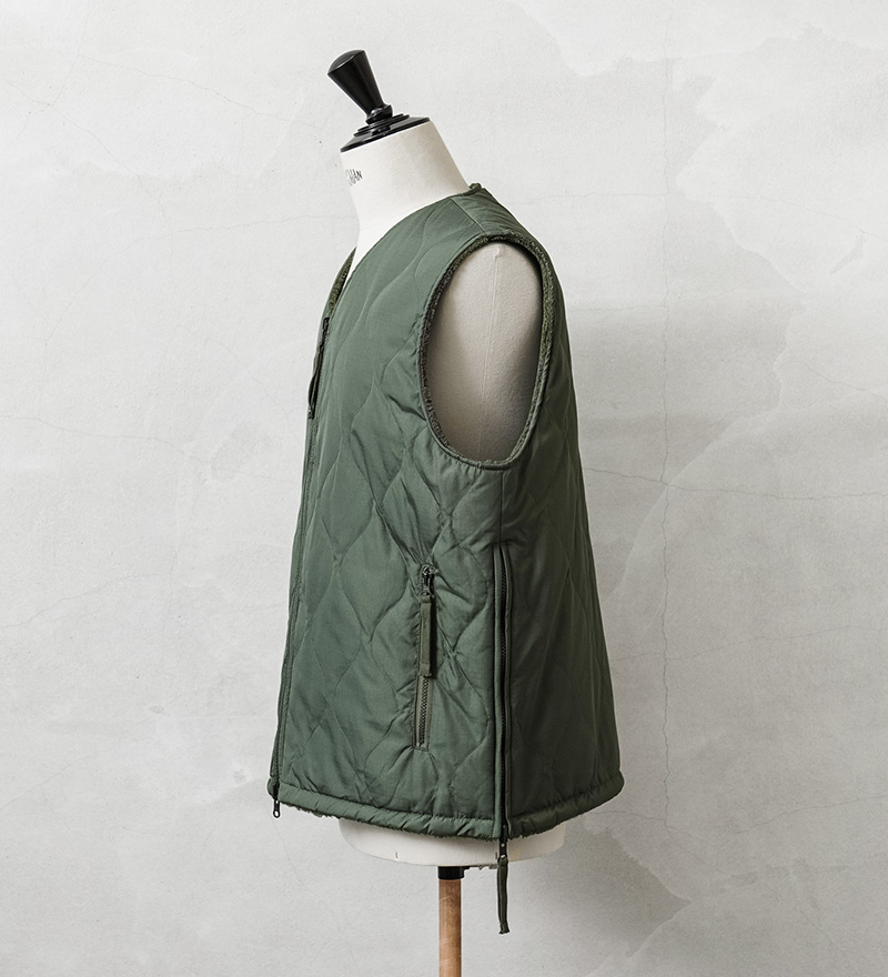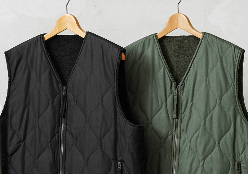 TAIONのMILITARY LINEは、表地には程よく厚みがあり軽量かつ引き裂き強度の強い5mm角のリップストップ生地を採用。撥水加工が施されており、少しの雨なら安心で汚れも付きにくい仕様です。ヘチマキルトステッチをデザインすることによってミリタリーテイストに仕上げ、ベーシックラインよりもさらにしっかりとしたつくりを感じていただけるアイテムです。軽くて弾力のある800フィルパワーのダウンを使用。一般で使用されるダウンよりも軽くて、 暖かい空気をたくさん含むことができます。ダウンとボアの二重構造により防風性・防寒性をアップ。さらにダウンベスト・ボアフリースベストのリバーシブルデザインでその日の気分やコーディネートに合わせて着る楽しむことができます。首元はスッキリと見せてくれるVネックラインで、シャツやフーディーなどの重ね着と相性抜群◎