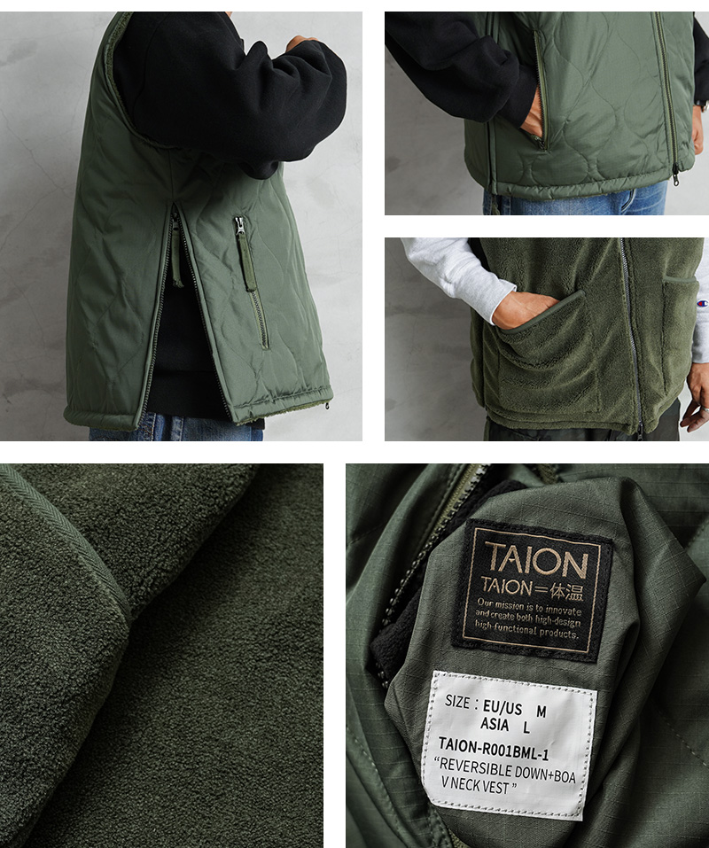 | 商品名 | TAION タイオン TAION-R001BML-1 MILITARY LINE リバーシブル Vネック ボア ベスト |