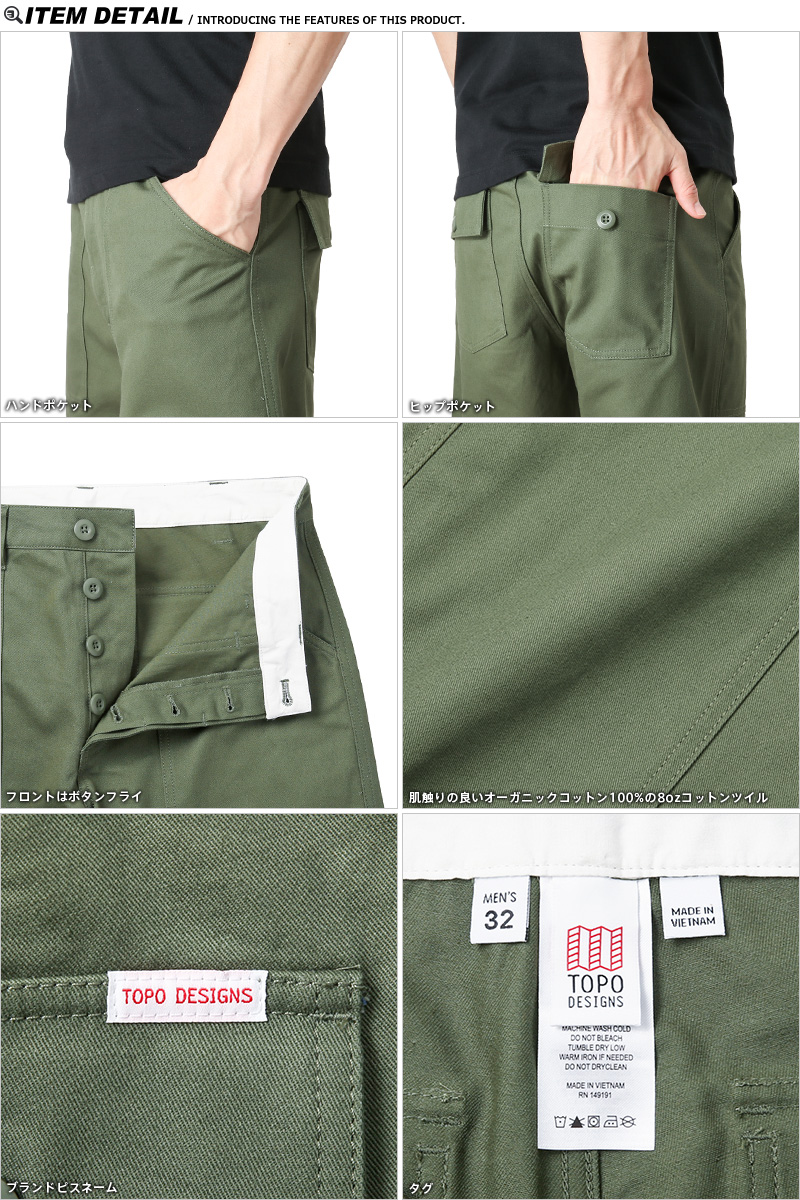 | 商品説明 | TOPO DESIGNS トポデザイン FIELD SHORTS フィールドショーツ のご紹介です。 品名:FIELD SHORTS - MEN’S TOPO DESIGNSより、ミリタリーテイストのフィールドショーツが登場。 アメリカ軍で1960年代まで採用されていた「ファティーグパンツ」のディテールが随所に取り入れられたアイテムで、フロントに設けられたパッチポケットが特徴的な一本。生地には程よい厚みの8ozオーガニックコットンツイルを採用。コットン100%ならではのさらりとした肌触りで、履き心地抜群です。 色々なスタイルに合わせやすい使い勝手の良いデザインと、ストレスなく履けるゆったりめのサイズ感で履き心地・着回し力抜群です!これ一本あればタウンユースからアウトドアまで幅広いシーンで重宝するイチ押しのアイテムです。 [製品特徴] ・8oz.オーガニックコットンツイル ・ボタンフライ ・BDUボタン ・ベルトループ ・フロントパッチポケット×2、フラップ付きバックポケット×2 ・リラックスフィット |