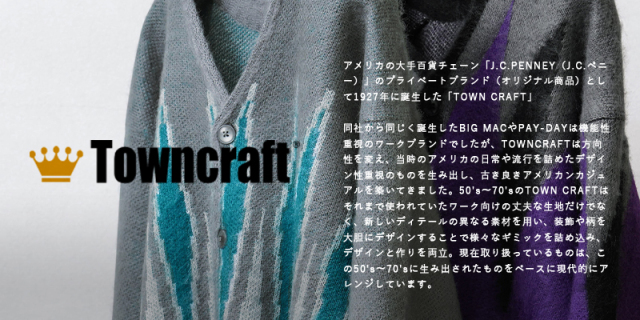 | ブランド | ![]() アメリカの大手百貨チェーン「J.C.PENNEY(J.C.ペニー)」のプライベートブランド(オリジナル商品)として1927年に誕生した「TOWN CRAFT」。同社から同じく誕生したBIG MACやPAY-DAYは機能性重視のワークブランドでしたが、TOWNCRAFTは方向性を変え、当時のアメリカの日常や流行を詰めたデザイン性重視のものを生み出し、古き良きアメリカンカジュアルを築いてきました。50's~70'sのTOWN CRAFTはそれまで使われていたワーク向けの丈夫な生地だけでなく、新しいディテールの異なる素材を用い、装飾や柄を大胆にデザインすることで様々なギミックを詰め込み、デザインと作りを両立。現在取り扱っているものは、この50's~70'sに生み出されたものをベースに現代的にアレンジしています その他のTOWNCRAFT タウンクラフトはこちら |