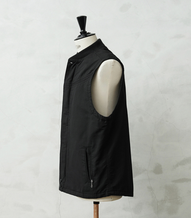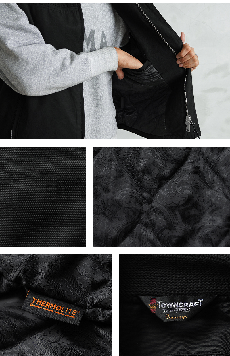 今回、60年代のTOWN CRAFT ダービージャケットをベースに【ダービーベスト】を作製しました。 シェルの素材は70年代のアウトドアブランドで主力だった【コットンナイロン】を使用。 特徴としては、湿気を吸うとコットンが膨張して水分の侵入を防いでくれ通気性もよく、磨耗に強い堅牢な素材です。 さらに中綿には【THERMOLITE】を使用。「暖かさ」と「軽さ」に特化しているのでボリュームを抑えつつも防寒性は抜群です。 また、今回のモデルでは新色のMUSTARDとOLIVEを追加し、より幅広いスタイリングに対応。 フロントはダブルジッパー仕様にアップデートし、開閉の自由度と快適さを追求しました。 さらにポケットの深さを約1cmプラスすることで、実用性も向上しています。