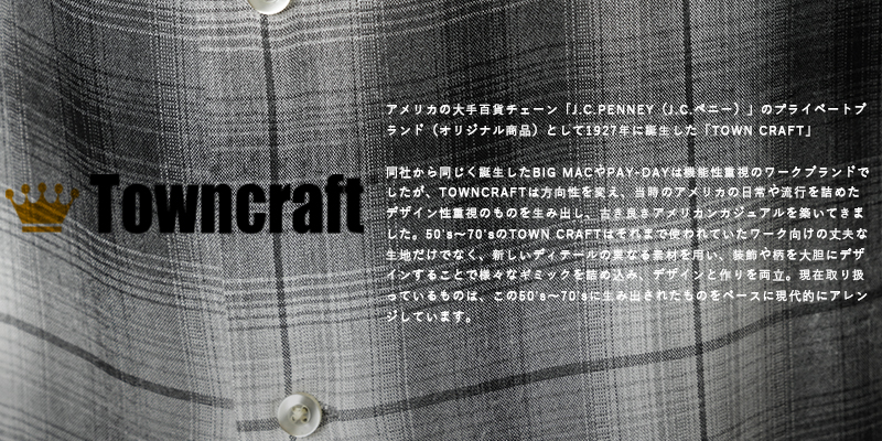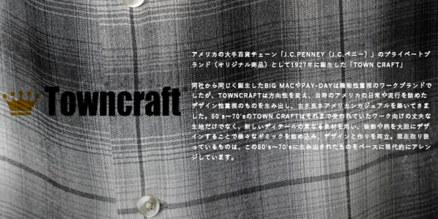 | ブランド | ![]() アメリカの大手百貨チェーン「J.C.PENNEY(J.C.ペニー)」のプライベートブランド(オリジナル商品)として1927年に誕生した「TOWN CRAFT」。同社から同じく誕生したBIG MACやPAY-DAYは機能性重視のワークブランドでしたが、TOWNCRAFTは方向性を変え、当時のアメリカの日常や流行を詰めたデザイン性重視のものを生み出し、古き良きアメリカンカジュアルを築いてきました。50's~70'sのTOWN CRAFTはそれまで使われていたワーク向けの丈夫な生地だけでなく、新しいディテールの異なる素材を用い、装飾や柄を大胆にデザインすることで様々なギミックを詰め込み、デザインと作りを両立。現在取り扱っているものは、この50's~70'sに生み出されたものをベースに現代的にアレンジしています その他のTOWNCRAFT タウンクラフトはこちら |