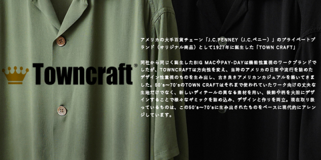 | ブランド | ![]() アメリカの大手百貨チェーン「J.C.PENNEY(J.C.ペニー)」のプライベートブランド(オリジナル商品)として1927年に誕生した「TOWN CRAFT」。同社から同じく誕生したBIG MACやPAY-DAYは機能性重視のワークブランドでしたが、TOWNCRAFTは方向性を変え、当時のアメリカの日常や流行を詰めたデザイン性重視のものを生み出し、古き良きアメリカンカジュアルを築いてきました。50's~70'sのTOWN CRAFTはそれまで使われていたワーク向けの丈夫な生地だけでなく、新しいディテールの異なる素材を用い、装飾や柄を大胆にデザインすることで様々なギミックを詰め込み、デザインと作りを両立。現在取り扱っているものは、この50's~70'sに生み出されたものをベースに現代的にアレンジしています その他のTOWNCRAFT タウンクラフトはこちら |